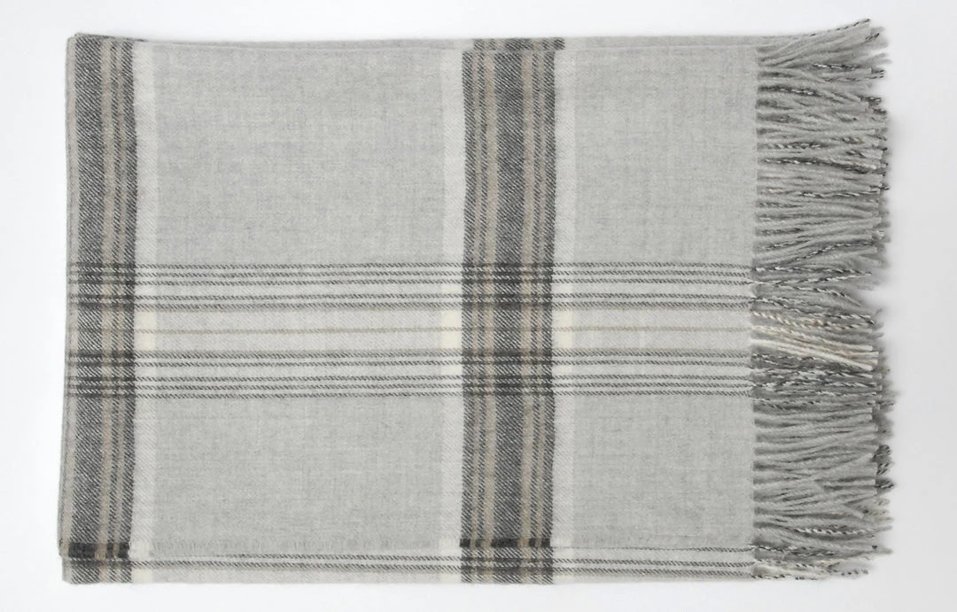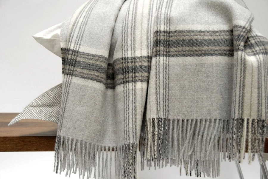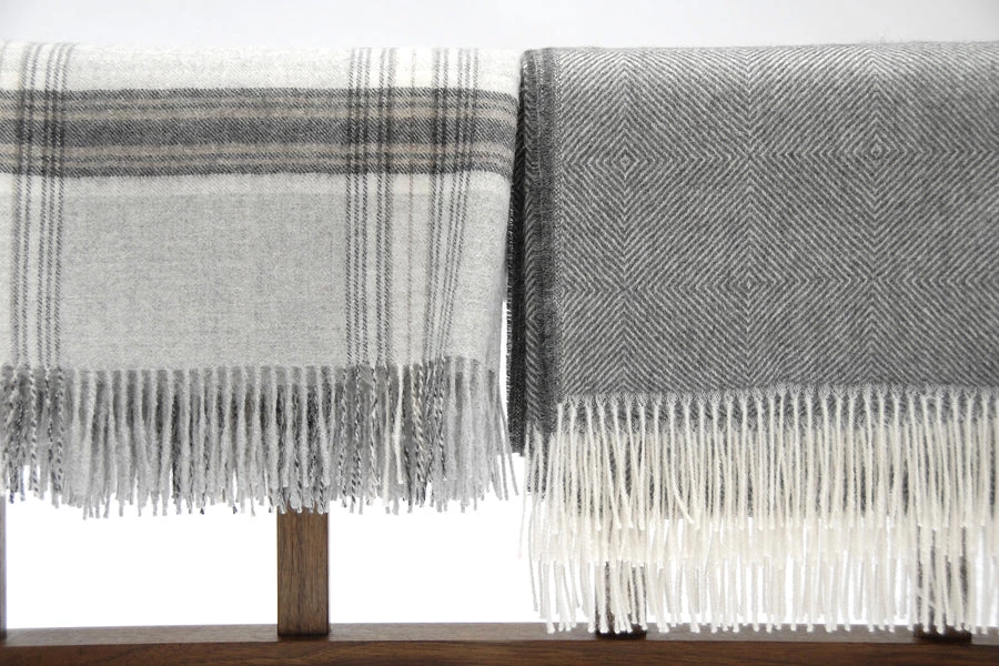 Neutral plaid pattern in soft grey, graphite, creme and almond baby alpaca. Throw is 51×70” and has a fringe. Both JASPER and COLIN are great gift ideas for holiday. Available now.