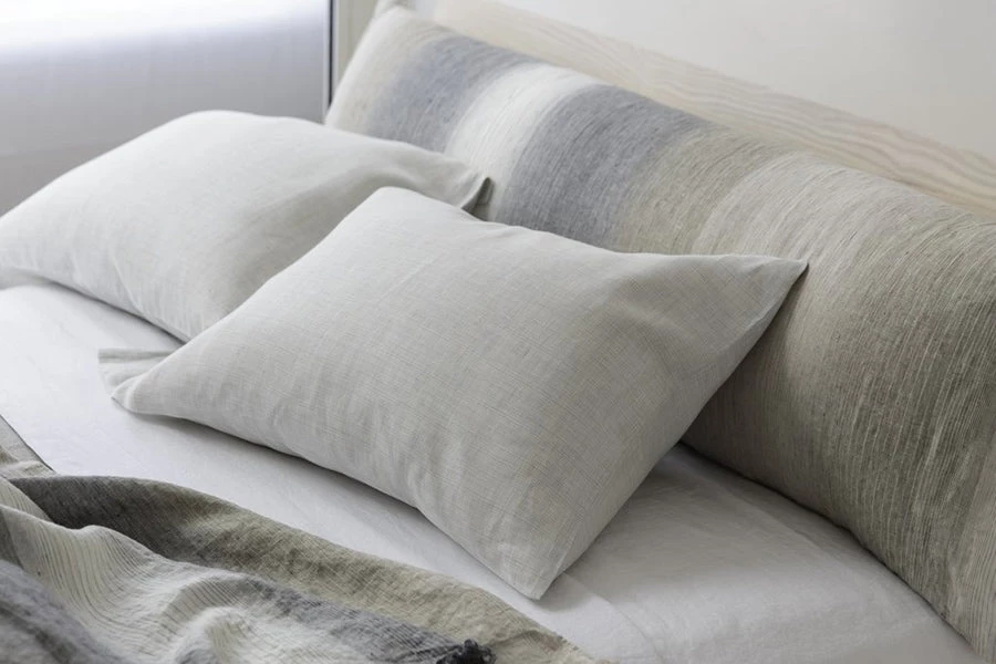 The Miles Grey Linen Pillowcase is made of woven linen, with a gradation of beige, grey and cream colors. This more rustic linen is heavier than traditional linen. This case is available in Euro square and body pillow sizes.