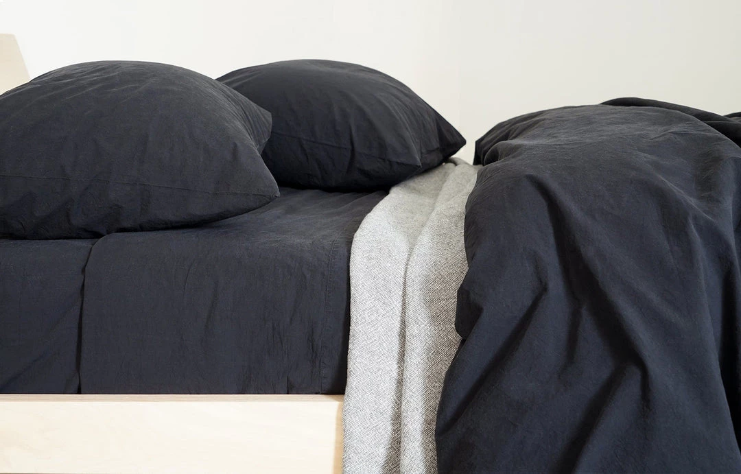 Washed, dyed organic cotton percale sheets. ANTON is a soft-to-the-touch, crisp, classic percale weave, dyed in small batches and pre-washed for an easy, sink-into-bed modern style. Medium weight, breathable, fresh and unstudied. A smooth, non-fussy collection of natural organic cotton bedding, cool, soothing and relaxed to the touch. Fitted sheet has an elastic top and bottom and a 14″ drop.