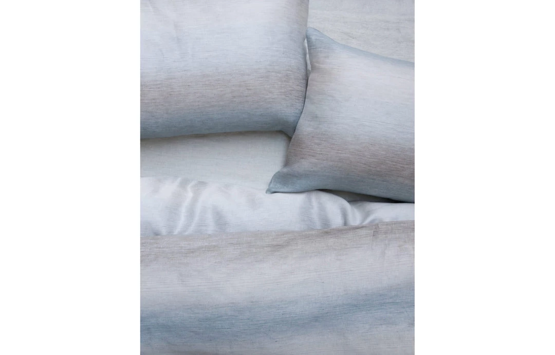 100% linen ombre pattern in soft color tones. Mineral is a mix of 2 blue tones with pale grey and taupe. Powder is a soft pink with ivory and natural. The weave is a smooth satin type with a subtle sheen. The design has an equally soft and striking look.
