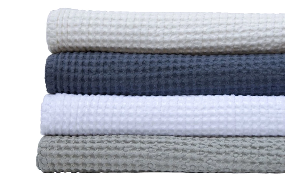 Lightweight cotton blankets in something like a cross between a honeycomb and a waffle weave. They have great texture and drape, and are a good way to layer in some color and interest to any bedroom. Pair with ANTON sheets in coordinating or contrasting colors to create a fresh new look.