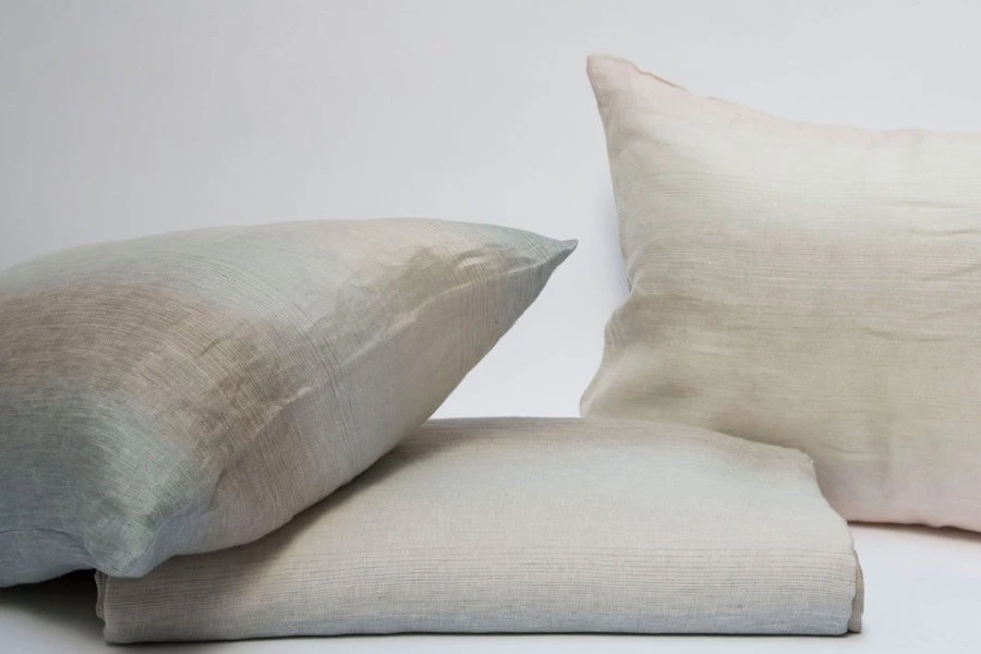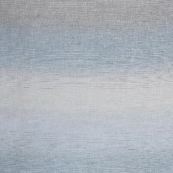 100% linen ombre pattern in soft color tones. Mineral is a mix of 2 blue tones with pale grey and taupe. Powder is a soft pink with ivory and natural. The weave is a smooth satin type with a subtle sheen. The design has an equally soft and striking look.