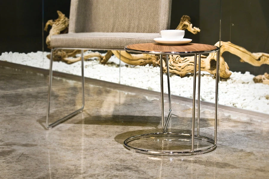 With a round table and elegant look, Petty exhibits a posture in any space it is installed. The circular form of the tabletop is continued and repeated on the bottom through the solid slim metal profile. The main frame is manufactured from solid transmission bars, coated in chrome or static paint colors. It’s a handy table to carry around for a drink or any other use around a sofa or lounge chair. The tabletop can be made of marble, veneers, matt lacquer.