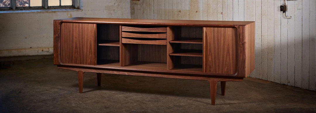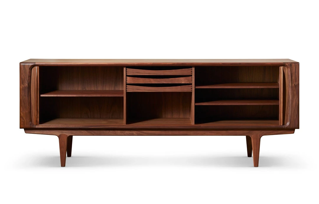 Sideboard no. 142 was designed in 1965 and taps into the essence of Danish Modern with its clean lines, functional design and expert craftsmanship. The piece features tambour doors that roll seamlessly into the back. A rare technique today that is not only pleasing to the eye, but also functionally ideal as it minimizes the space needed. The interior of the cabinet is beautifully finished with shelves on each side and a middle section with optional pull-out dovetail trays for added storage. The curved front edges are constructed in solid wood as are the tambour doors, base and legs. To add extra detail to the design, the legs are pulled slightly under the sideboard to account for skirting, making it possible to place the sideboard up close to the wall. With a veneered back it can also find great use as a room divider. The eloquent lines and high quality cabinetmaking are sure to make this piece of furniture look beautiful in any setting. The sideboard comes in two lengths and every piece is made in Denmark and individually numbered on final assembly. Bernh. Pedersen & Søn, a Danish furniture maker, has a long and strong tradition in furniture and cabinetmaking stretching all the way back to the company’s start in 1902. Through three generations the family firm has created and sold classic Danish furniture to many parts of the world. The period 1950 – 1970 in particular was characterized by some of the most stunning and well-executed pieces in Bernh. Pedersen & Søn’s history. Especially the classic mid-century sideboards and daybeds designed by Danish furniture designers, including the Danish world-renowned Johannes Andersen, Svend Aage Madsen and Kurt Østervig who were – and still are – highly valued by customers worldwide. In 2015, great-grandson Thomas Bernhard Pedersen reestablished the company and started focusing exclusively on relaunching some of the exquisite furniture designed in the 50’s and 60’s.