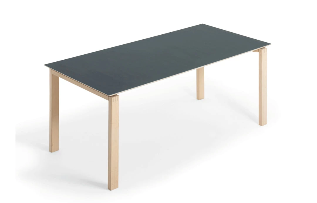 The table top is made from solid oak or a combination of plywood with linoleum or plywood with nanotech laminate, with an edge profile in natural or black lacquered plywood. The linoleum, which is available in 21 colours, has a matte look, feels warm to the hand and is renowned for its elegance and durability. The table legs are made from solid oak, untreated or black lacquered.
