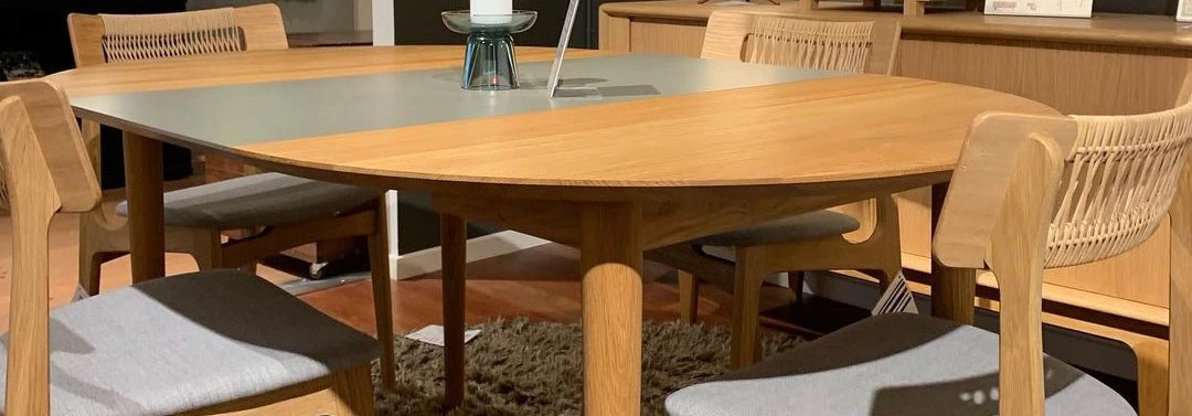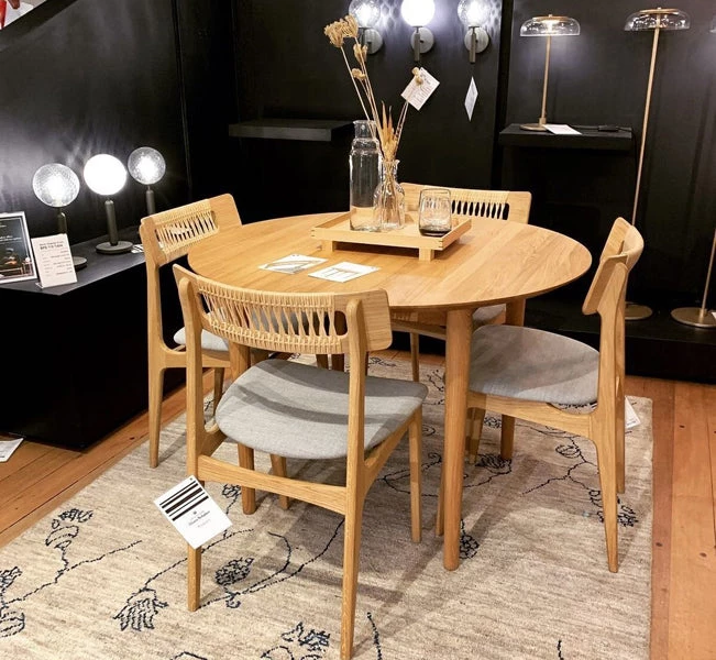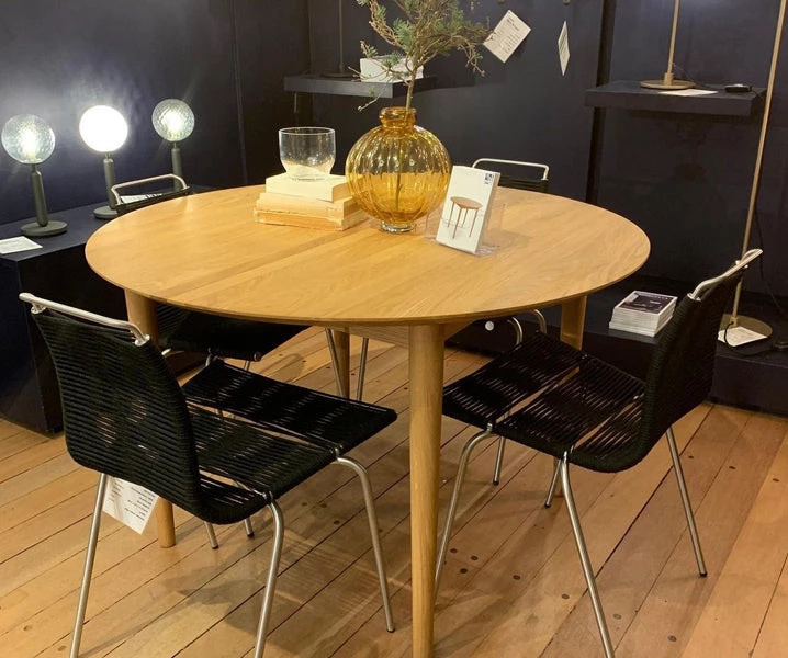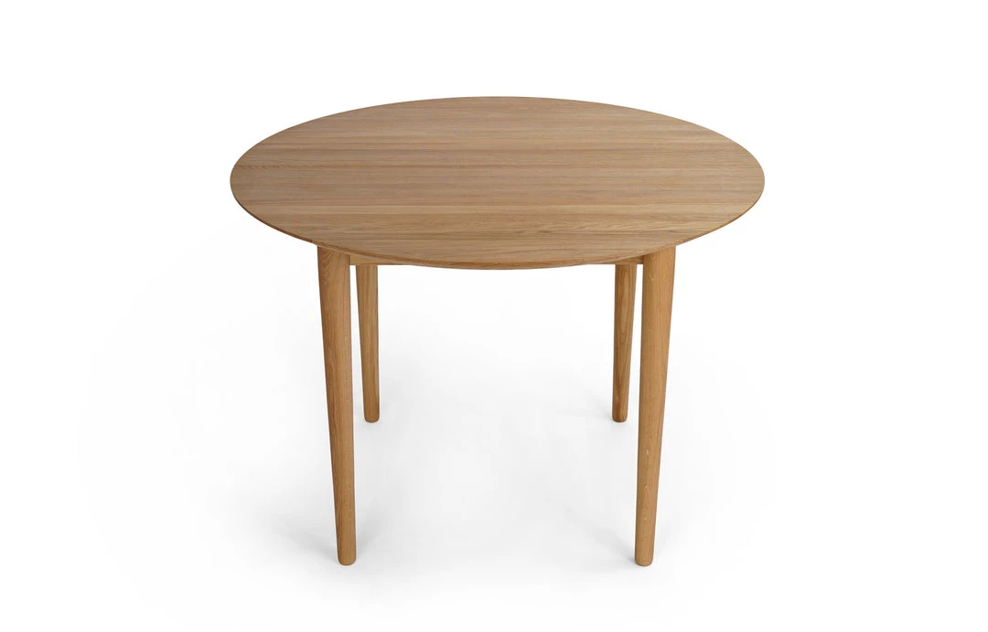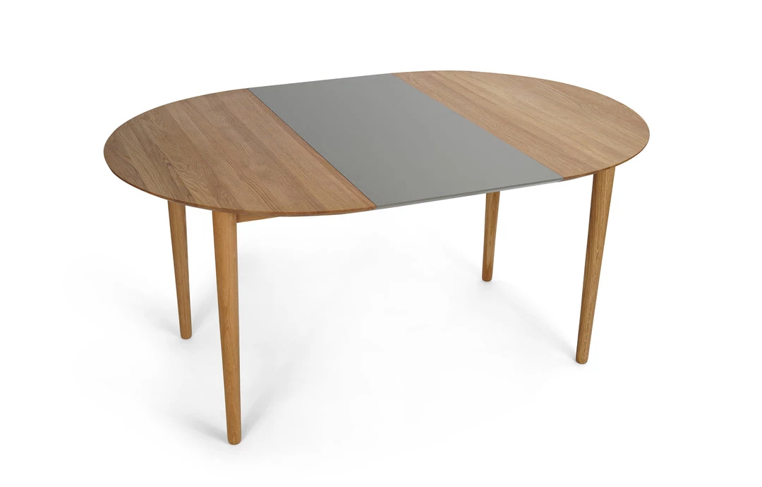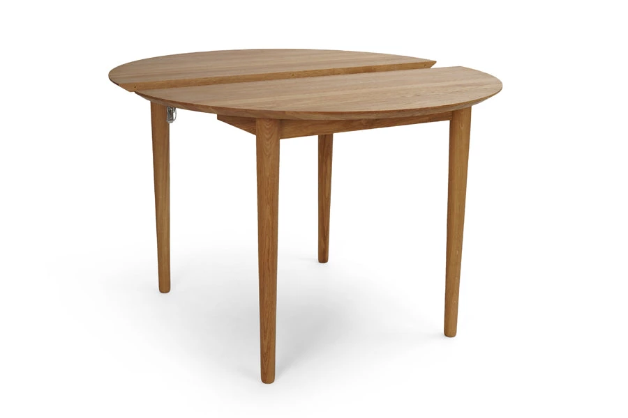 Round table in solid wood, extendable. Remains stable when pulled out. Extension leaves available in lacquered MDF or solid wood.