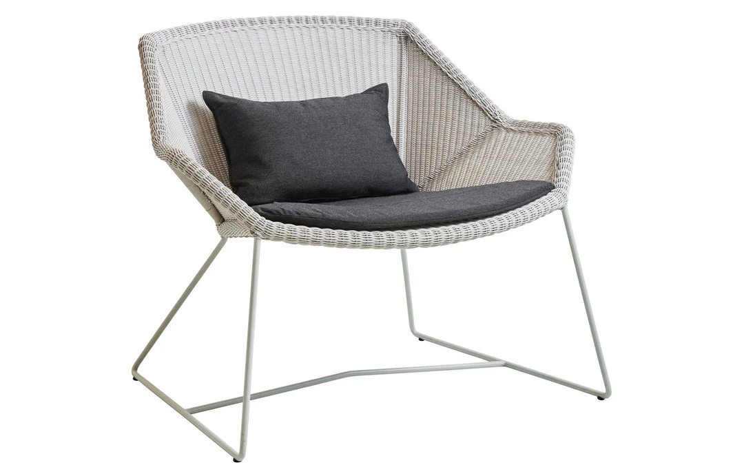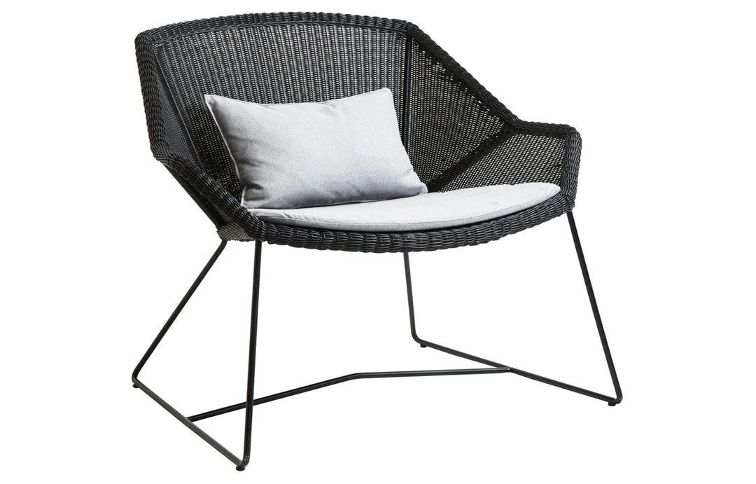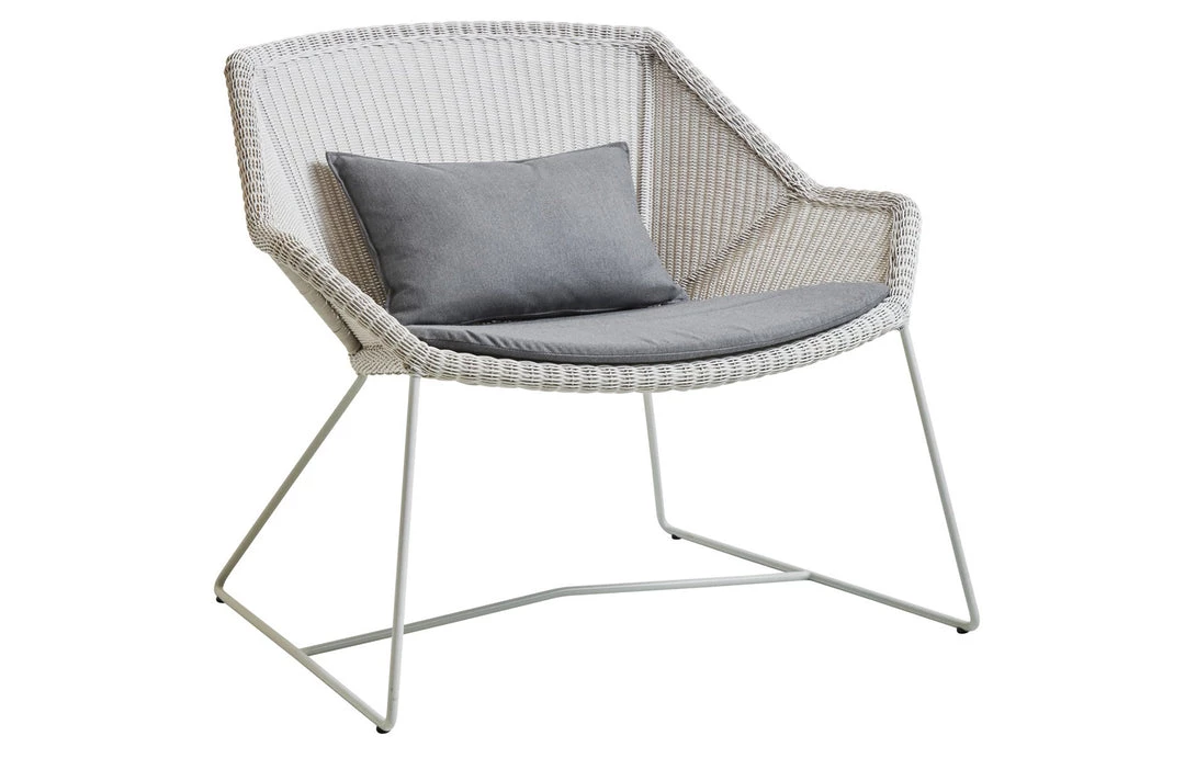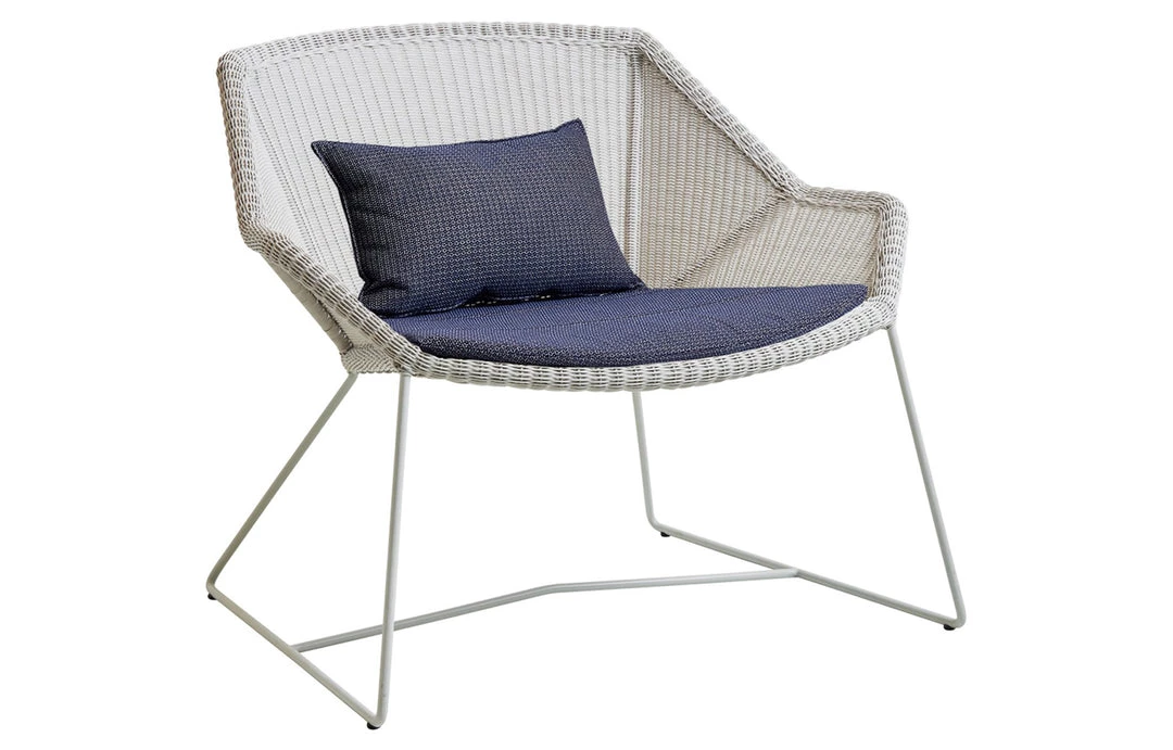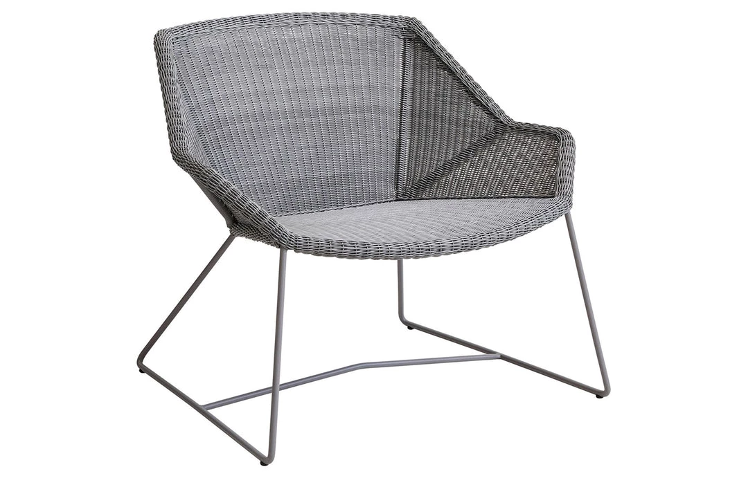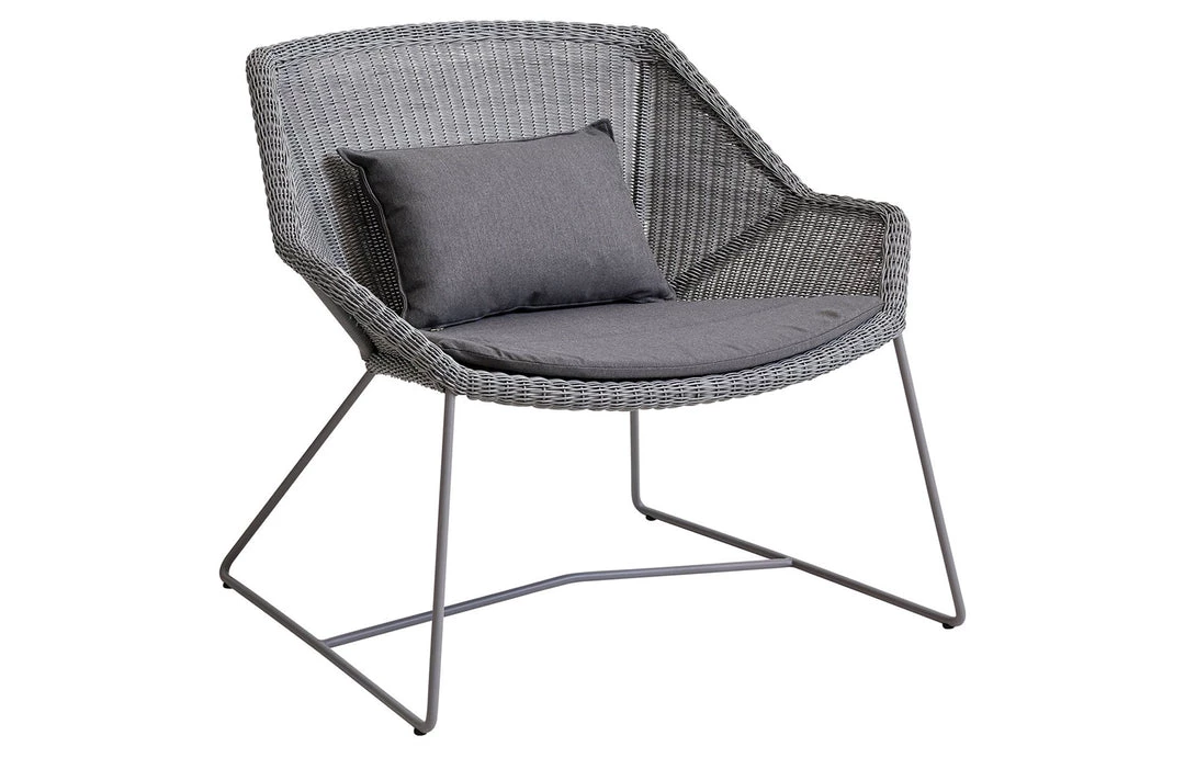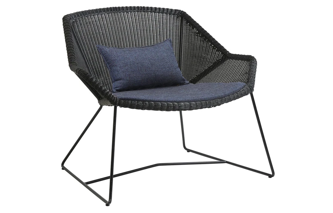 The elegant low inviting lounge chair is built up over a classic wire frame, and it is precisely the bent legs of the chair that provide the design with the unique lightness and elegance. The lounge chair is extremely comfortable. The high quality of the materials used means that the Breeze lounge chair can be left outside in all types of weather and environments, and still remain with low maintenance.