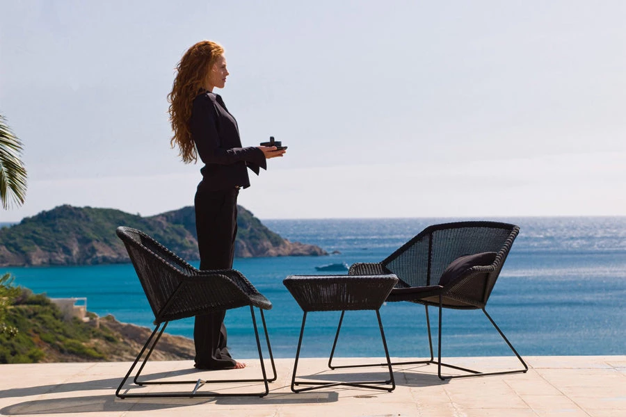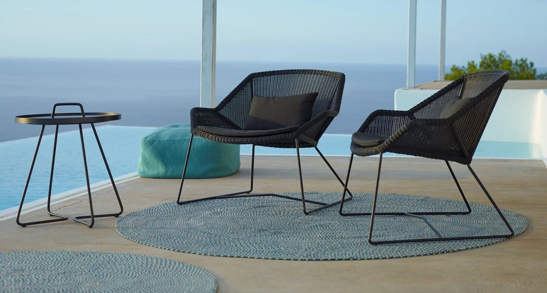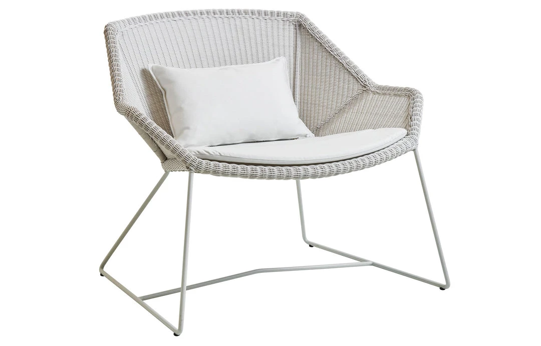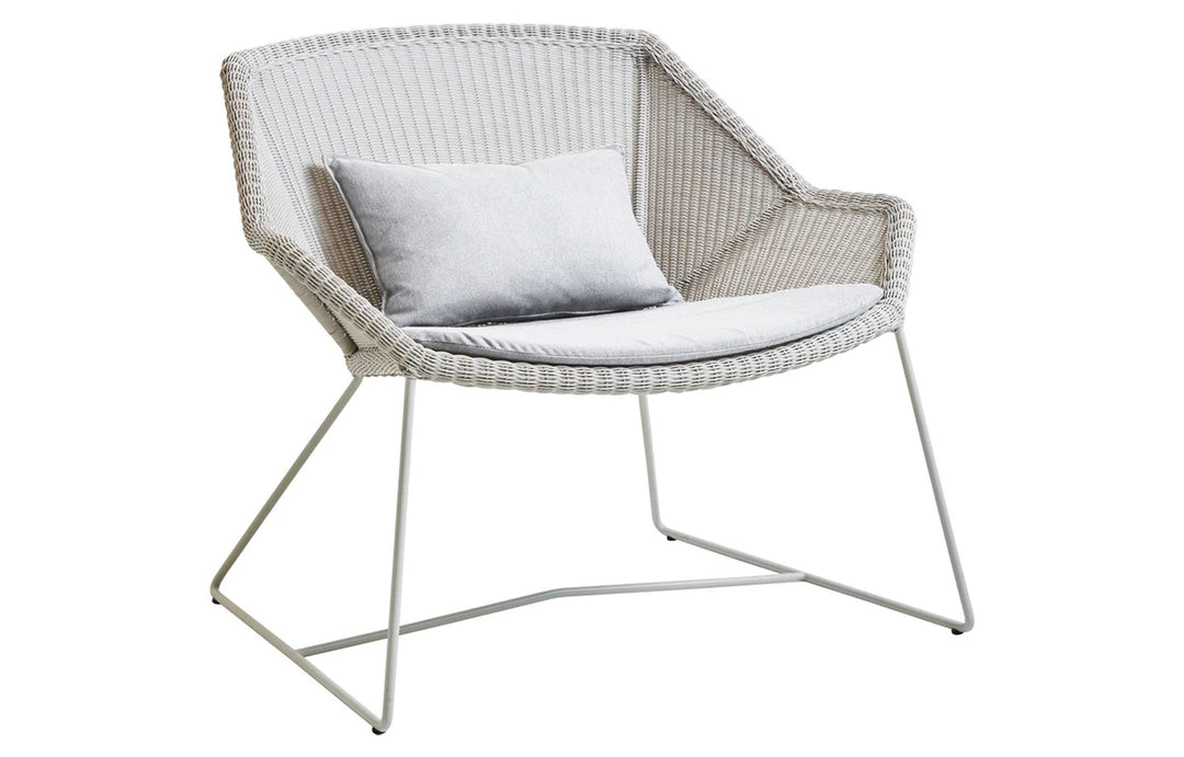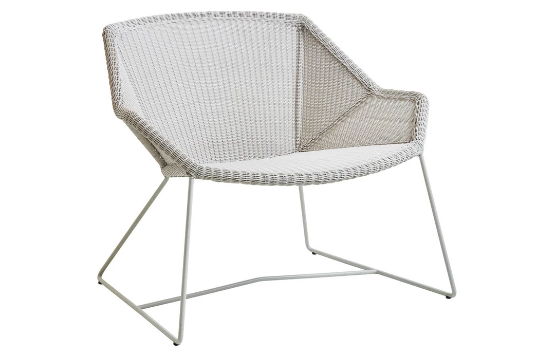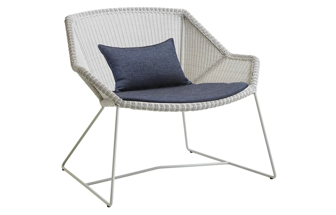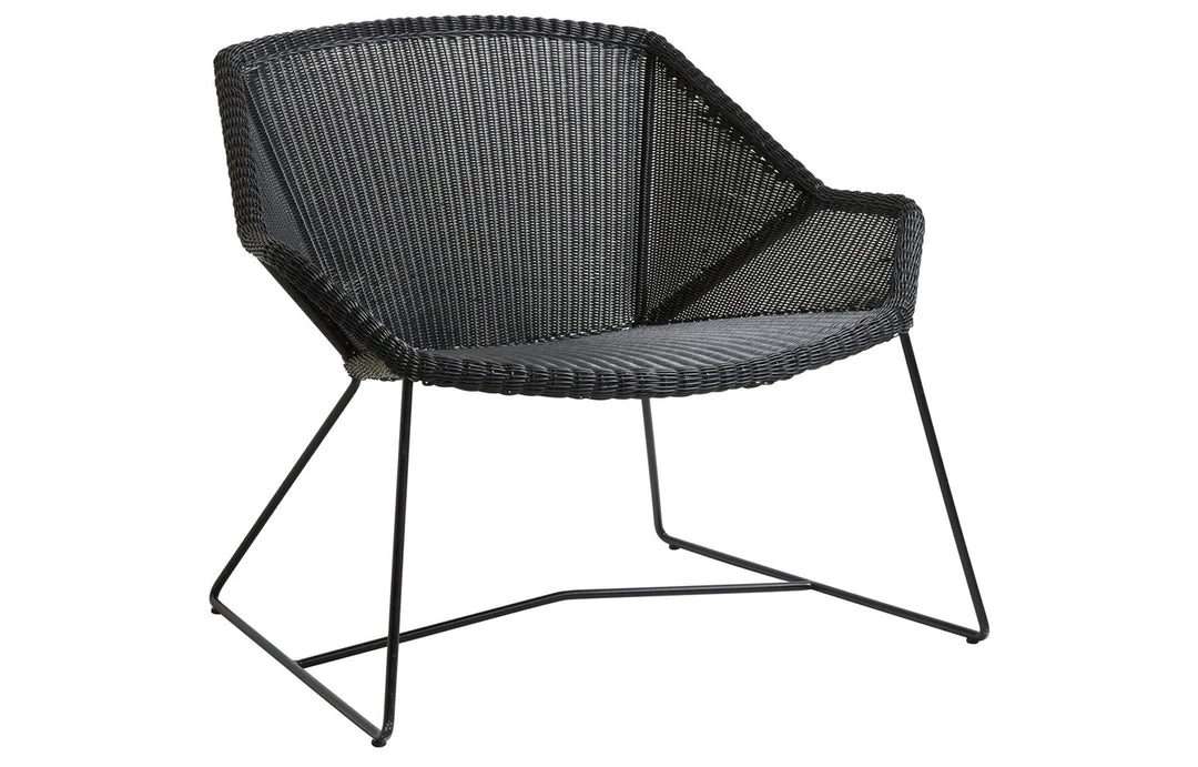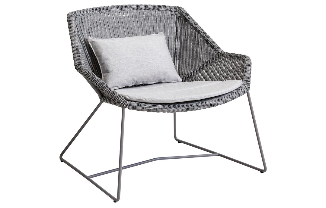 The elegant low inviting lounge chair is built up over a classic wire frame, and it is precisely the bent legs of the chair that provide the design with the unique lightness and elegance. The lounge chair is extremely comfortable. The high quality of the materials used means that the Breeze lounge chair can be left outside in all types of weather and environments, and still remain with low maintenance.