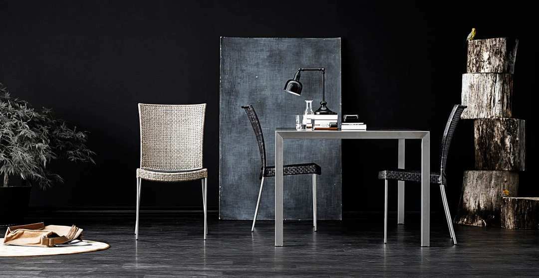 No-nonsense dining chair with classic lines in black-dyed or taupe, hand-woven rattan bark and stainless steel. The woven seat gives a lightweight appearance whilst providing excellent ventilation and comfort. The Casima chair is stackable.