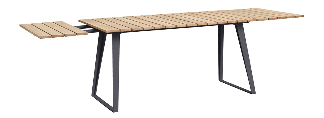 The idea behind the colored, lightweight aluminum is that the furniture will be a casual breath of fresh air in the often neutral garden furniture universe, both with colors and a contemporary, light look. The furniture takes up less space than traditional garden furniture. The elegant dining table, which is available with a teak table top with bevelled edges, the refined lines of which recur in the frame. With two leaves, the table measures as much as 243 cm – but with a very narrow width of 84 cm, it can still fit into many places. Cane-line teak is approved and cultivated according to SVLK certification system.