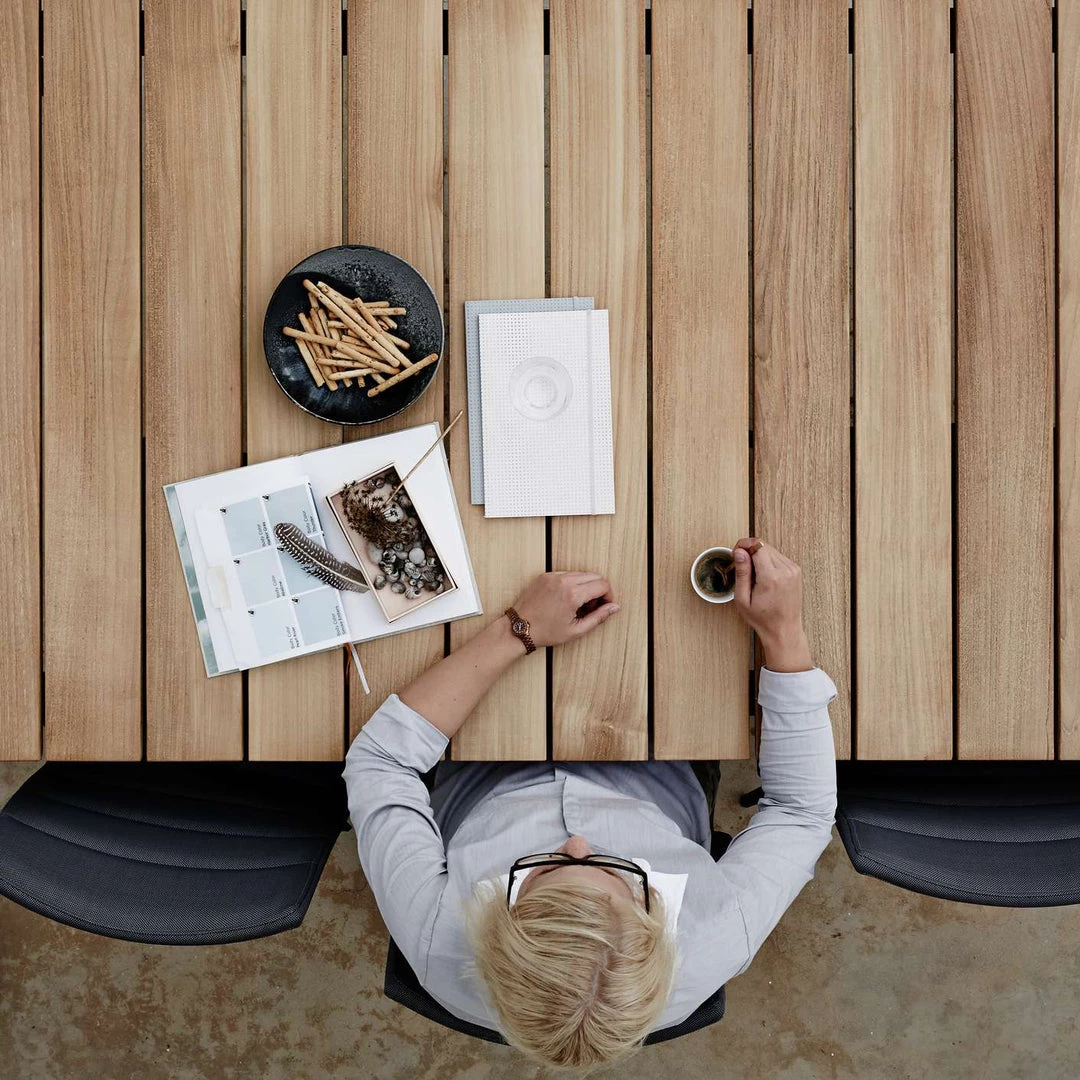 Our Core dining chair wo/armrest is made in the unique new Cane-line Soft-touch® material. The new soft and comfortable Soft-touch material is optimal for outdoor use. The Soft-touch material combines the soft feel know from a traditional indoor furniture fabric, with the unique outdoor all weather ability known from the Cane-line Tex® material. The overall aim was to create a highly comfortable dining chair without a cushion. Another demand to the design was to create a chair that was functional no matter the space available. Therefore it stacks well and has a lightweight construction allowing easy storage. The Core dining chair wo/arm is therefore both versatile and practical.