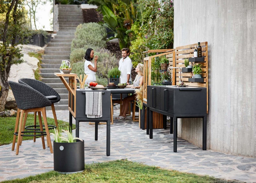 The Drop series designed by Cane-line design team consists of a collection containing an outdoor kitchen concept and elegant outdoor tables. The frame of the series is made of custom-designed profiles that ensure a strong construction and elegant finish. The series is inspired by a drop shape that gives a profile with both edges and soft curves. The Drop Kitchen is an impeccable outdoor kitchen, with a stylish yet vibrant and inviting expression. With Drop, Cane-line moves another indoor room into the garden, in order to extend the time spend with family and friends outdoors.