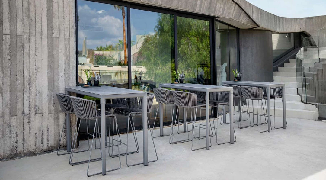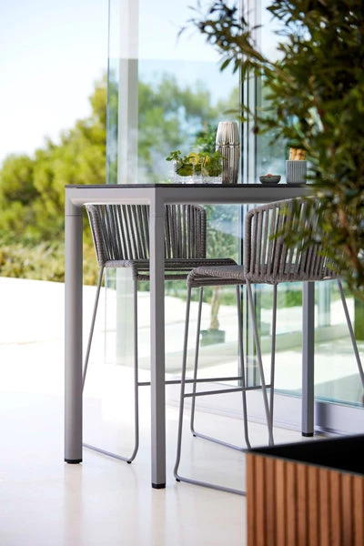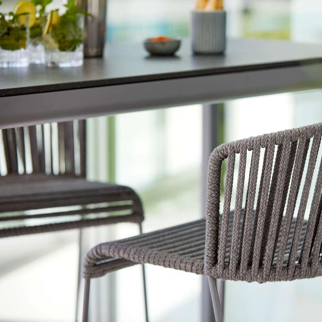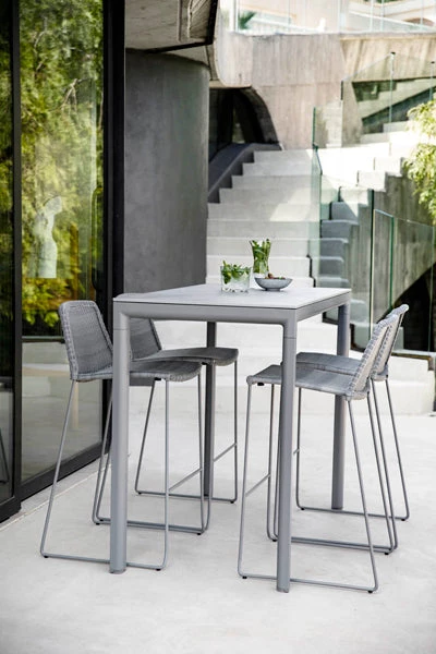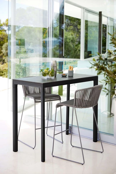 The Drop bar table combines an edgy tabletop with a softer shape in the aluminum frame. This provides a completely new style of outdoor tables to our assortment. The Drop series designed by Cane-line design team consists of a collection containing an outdoor kitchen concept and elegant outdoor tables. The frame of the series is made of custom-designed profiles that ensure a strong construction and elegant finish. The series is inspired by a drop shape that gives a profile with both edges and soft curves.