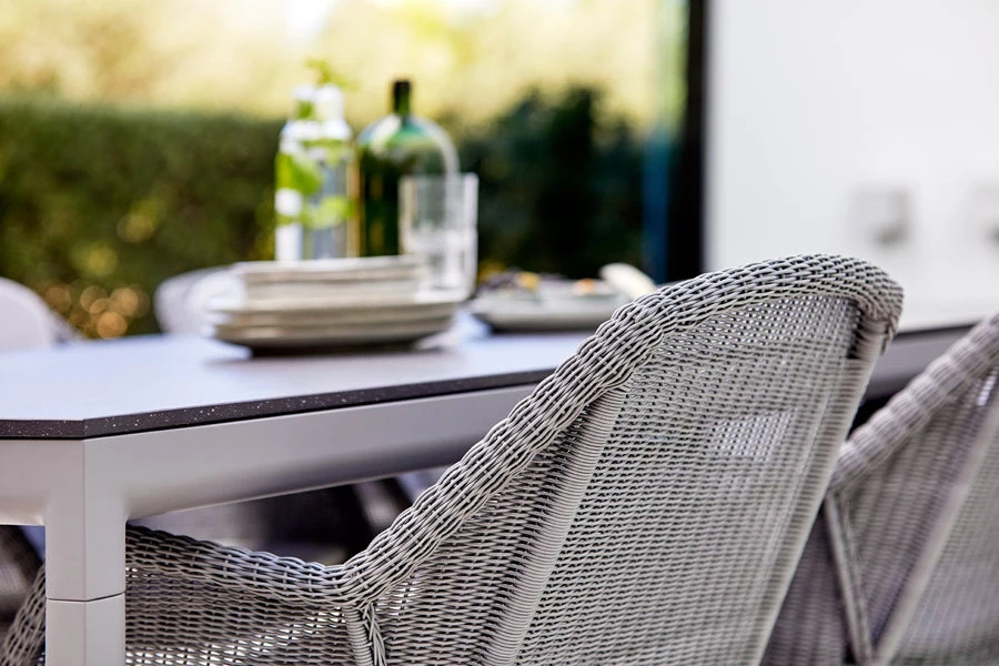 The Drop dining table combines an edgy tabletop with a softer shape in the aluminum frame. This provides a completely new style of outdoor tables to our assortment. The Drop series designed by Cane-line design team consists of a collection containing an outdoor kitchen concept and elegant outdoor tables. The frame of the series is made of custom-designed profiles that ensure a strong construction and elegant finish. The series is inspired by a drop shape that gives a profile with both edges and soft curves.