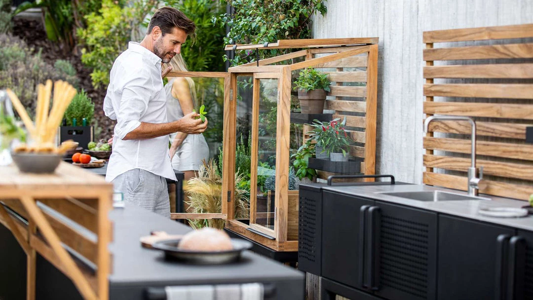 The Drop greenhouse is designed by the Cane-line design team, and is part of the Drop collection, which consists of an outdoor kitchen concept and a selection of outdoor dining tables. The greenhouse is made with a frame in warm teak with glass panes and two doors, so you can easily organize your favorite herbs and vegetables. Cane-line teak is approved and cultivated according to SVLK certification system. With the Drop Greenhouse, you get two practical movable shelves where your greens can be placed. The top of the greenhouse is easily clamped open to create air circulation for your plants, ensuring optimal growth conditions.