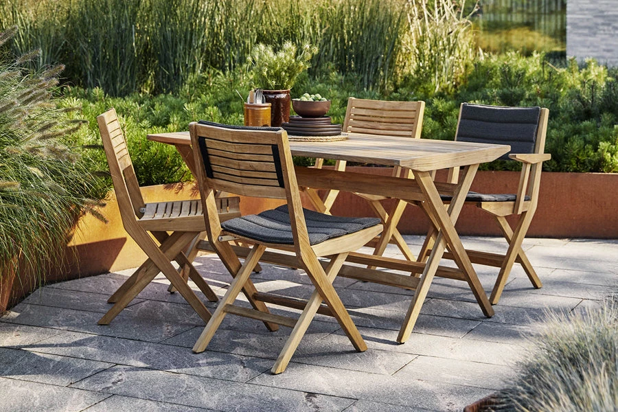 Flip is a folding table made of teak. Flip is a new interpretation of the classic folding tables with an emphasis on superb design and quality. The Danish duo Strand+Hvass are the designers behind the attractive design. The warm teak adds an inviting glow to the simple and elegant folding tables. Flip folding tables are ideal in cramped outdoor spaces with limited storage space. The folding tables are also available with cushions that provide added comfort.