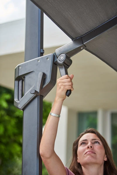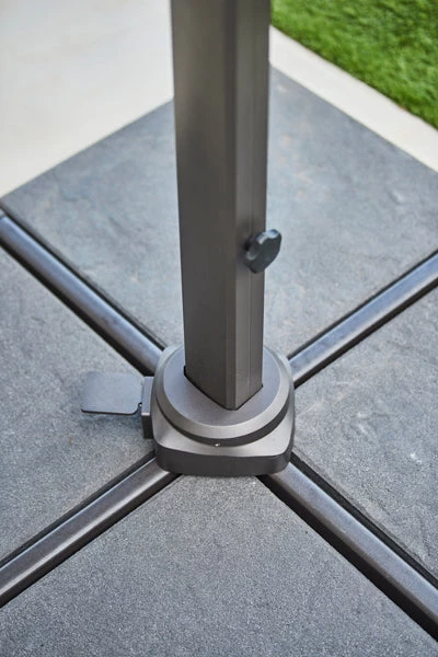 Hyde hanging luxe parasol is made of aluminum and comes in different fabric color choices. The Hyde parasol can rotate, which makes it easy for you to catch the sun. The Hyde parasol is sold including 4 x 25 kg stone tiles to hold it in place. We advise that the parasol is not used during heavy wind. Fabric is made of 100% Olefin 200gr/m2.