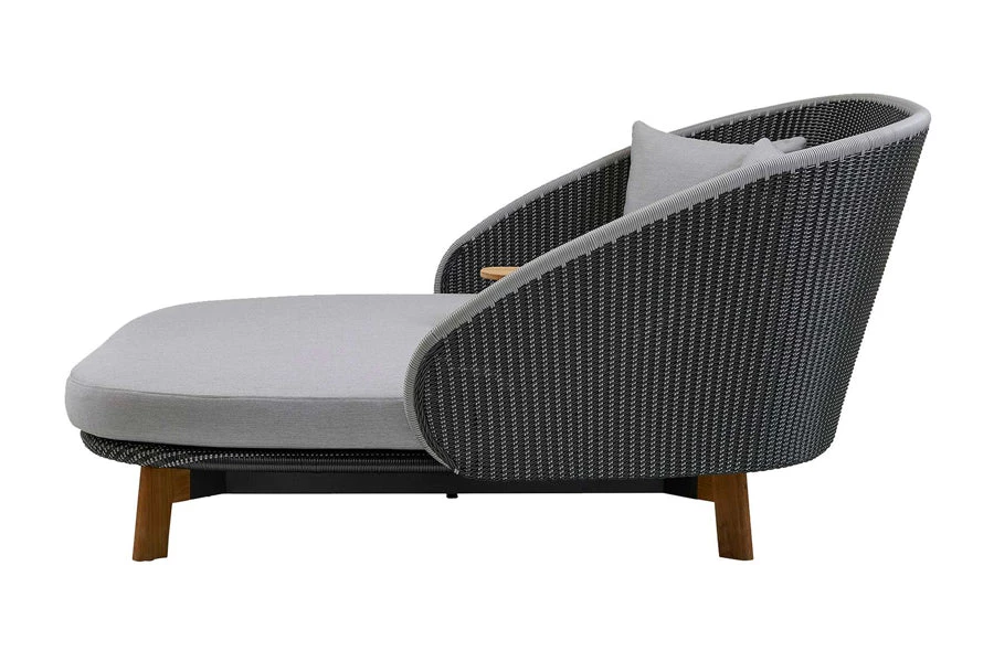 Peacock daybed is a beautiful visual furniture with comfort as the keyword. Peacock is a modern furniture designed by Foersom & Hiort-Lorenzen MDD. Peacock is available in Cane-line Weave, which makes Peacock ideal for outdoor use in any climate as it is temperature and UV-resistant. It comes with a cushion set + 4 large back cushions (60×60 cm.) The Daybed cushions comes in an outstanding color; Cane-line Natté light grey. The mix of two colors in the weave gives a very unique look. The Peacock Daybed comes with a small teak table, and can also be combined with our Classic parasol as an acquisition.