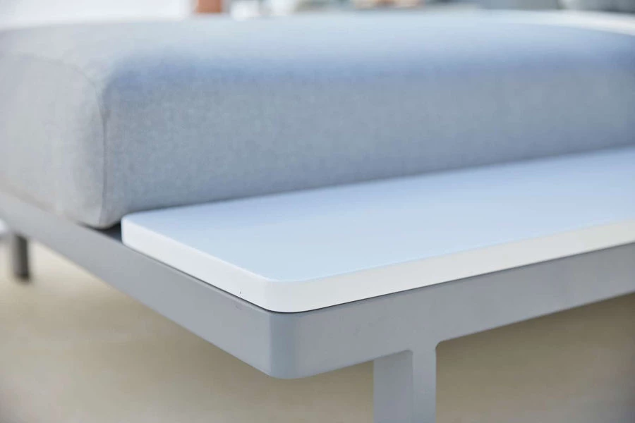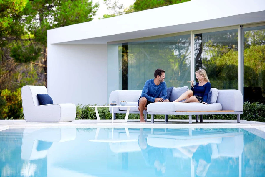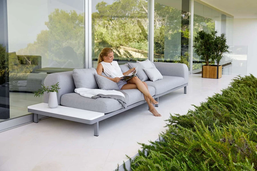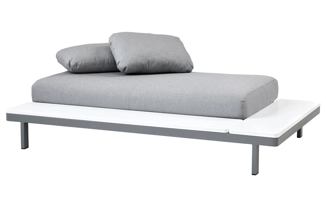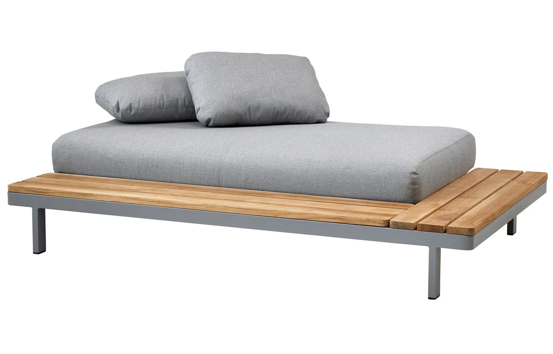Space is a lounge concept in a modern and Scandinavian design. The concept adds a new dimension to modular lounge sofas where one is capable of changing materials and functions and thereby the look. Space can stand as a lounge sofa, but one can also change the back and side modules into tables, so the lounge sofa can even change into a sunbed. The table plates are of either certified teak or solid surface material, the fabric is the soft and comfortable Cane-line AirTouch. This innovative and contemporary lounge concept is designed by the Danish design duo Foersom & Hiort-Lorenzen MDD.