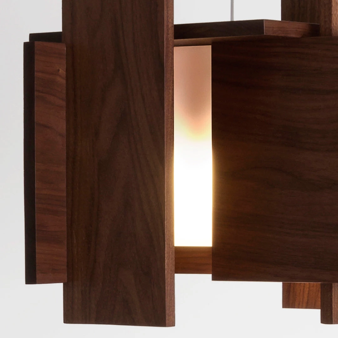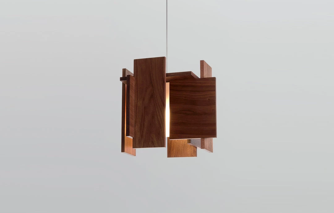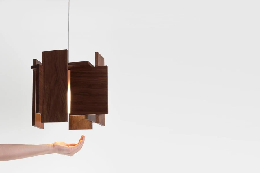 I wanted to create a simple geometric sculpture that lets the light inside just sneak out around the floating walnut planes: letting the natural wood fall in and out of the light. It is this play with contrast and light and shadow that makes the Abeo such a dynamic piece.