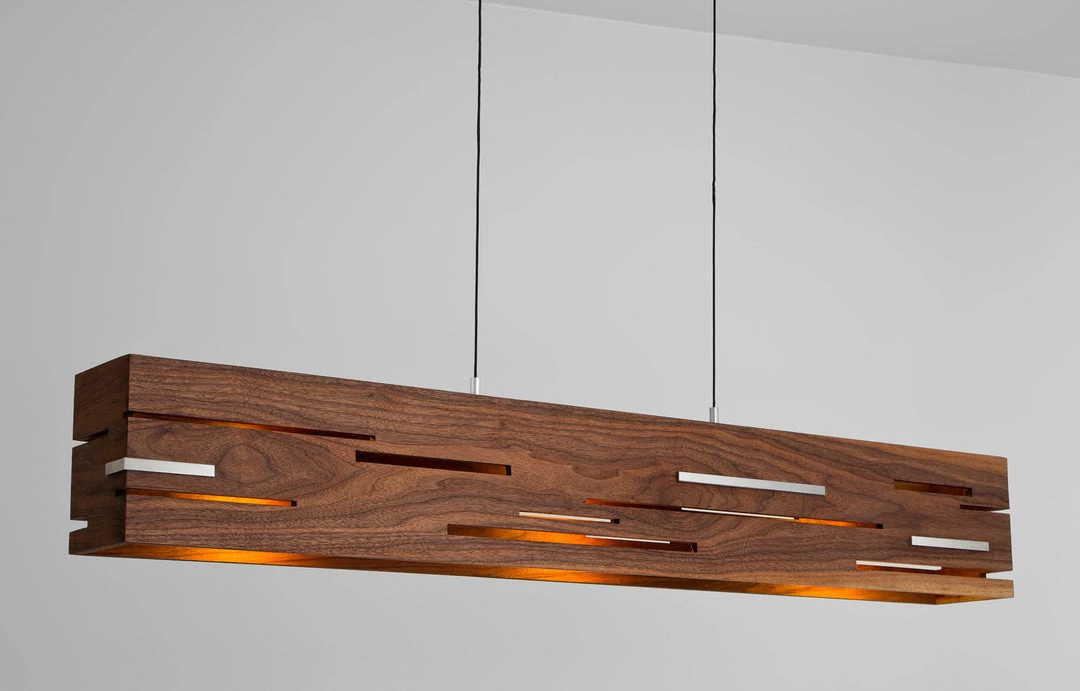 The Aeris was a collaboration with New York based designer Frank Carfaro of Desiron. The organic and often wild swirls of walnut grain are interrupted by rigorous slits and inlays that punctuate each face to create a beautiful juxtaposition, making each fixture unique. The glow of the illuminated wood seen through the cut slits creates a rich composition of light and shadow.