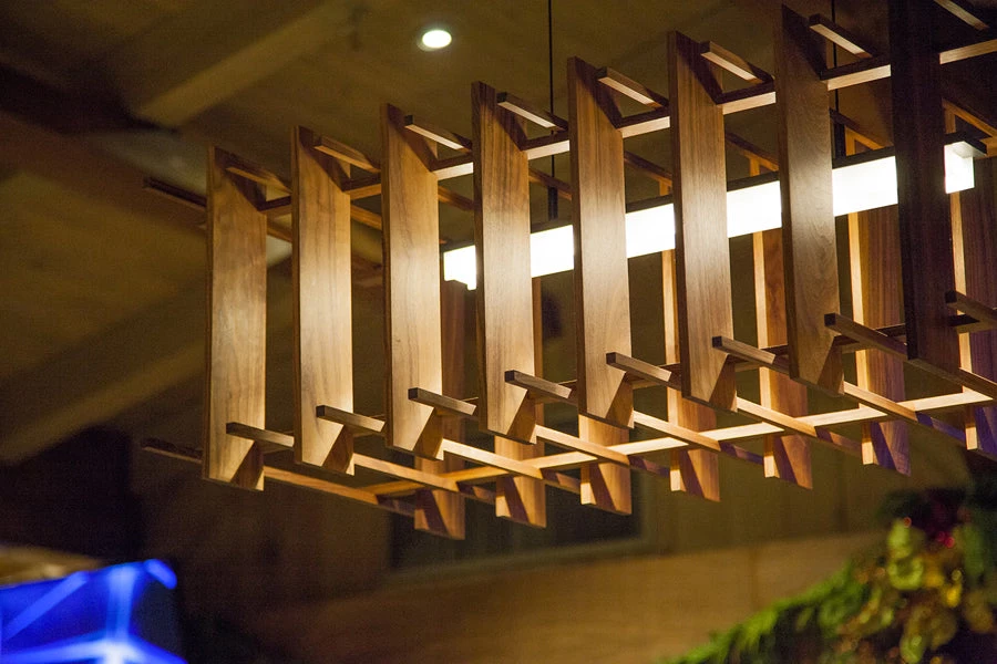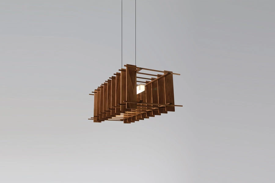 The Arca is an experiment with density and mass. As one moves around the room, the fixture morphs from a commanding presence of solid walnut into a graceful bar of light surrounded by an elegant porous cage.