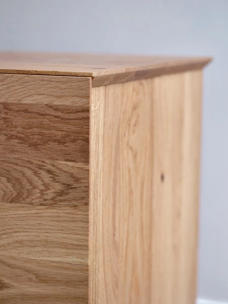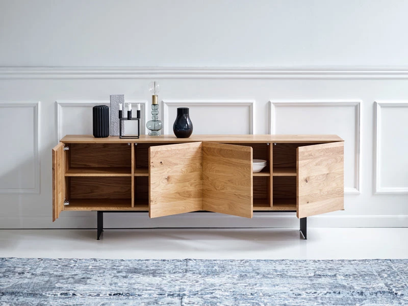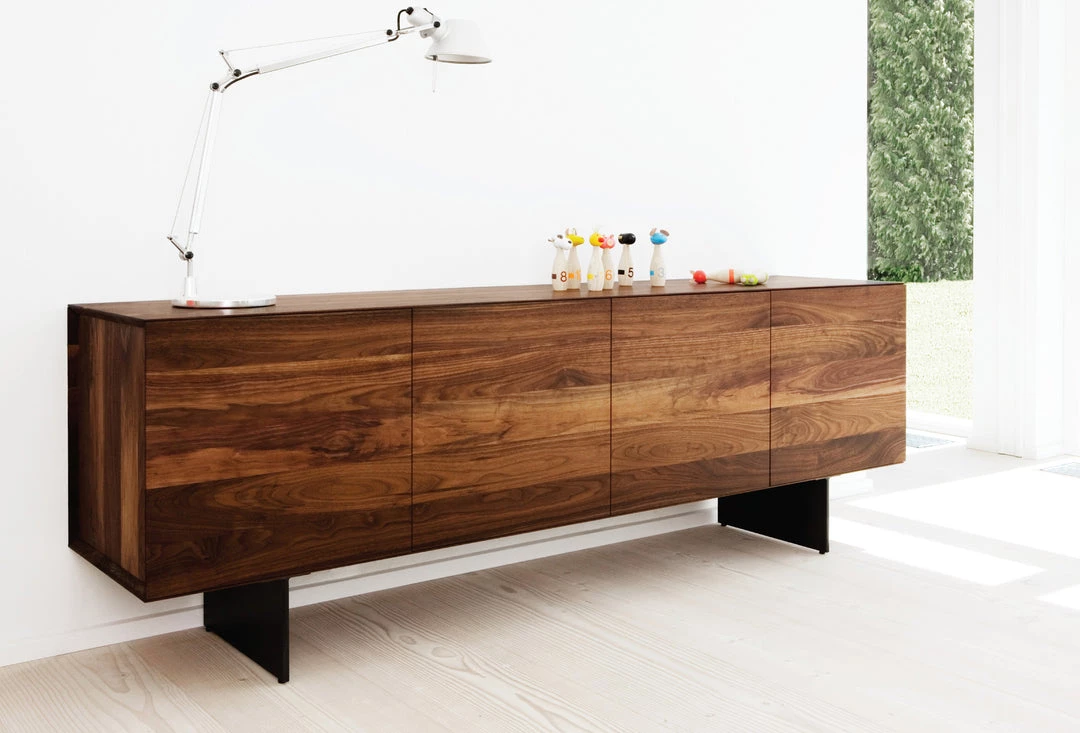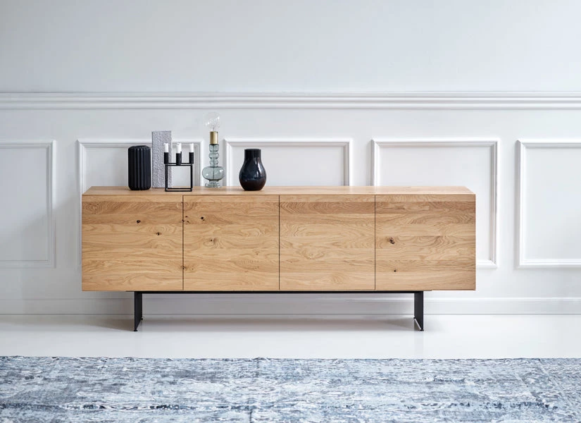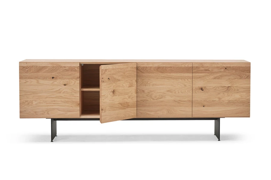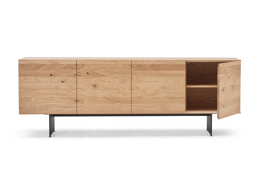 The beautiful RABA SIDEBOARD, designed by the Swiss-based German designer Rainer Bachschmid, can either be mounted on the wall or stand on the floor on top of two slim steel legs. The front of the sideboard has 4 doors and is made out of one piece of wood, which gives a harmonious and natural overall impression. The sideboard comes with 1 preinstalled shelf in each of the 4 compartments, and it is also possible to add cutlery drawers, maximum 3 drawers per compartment.