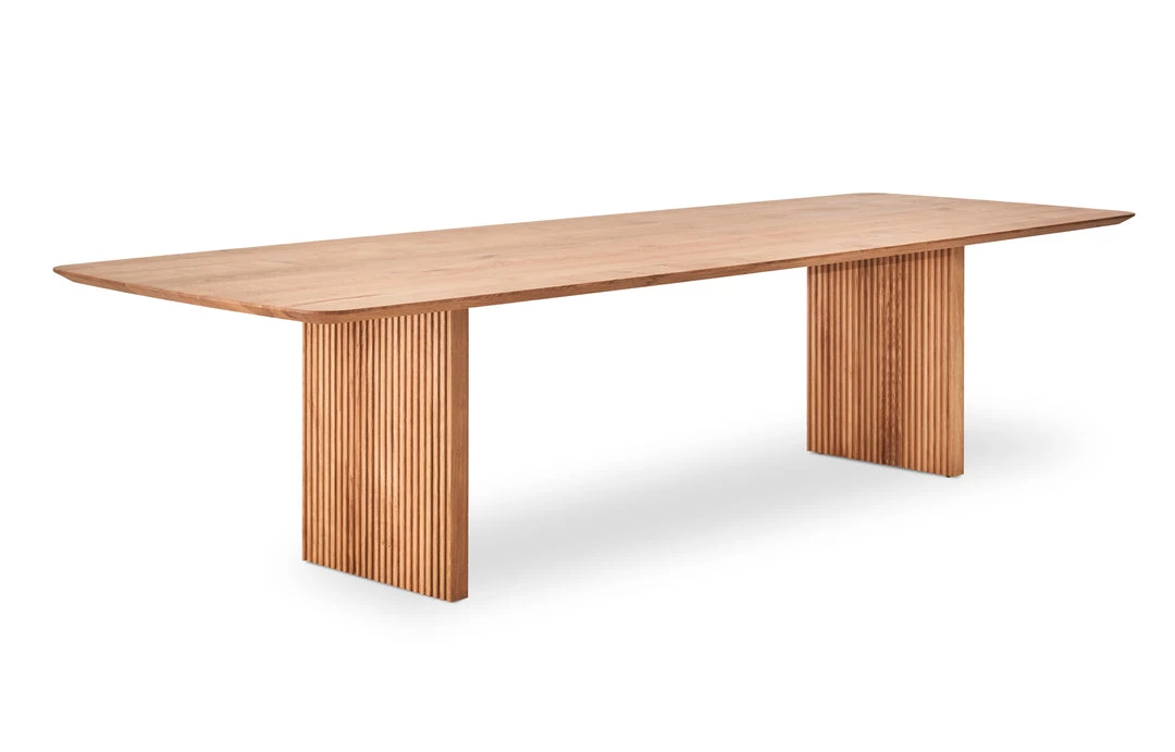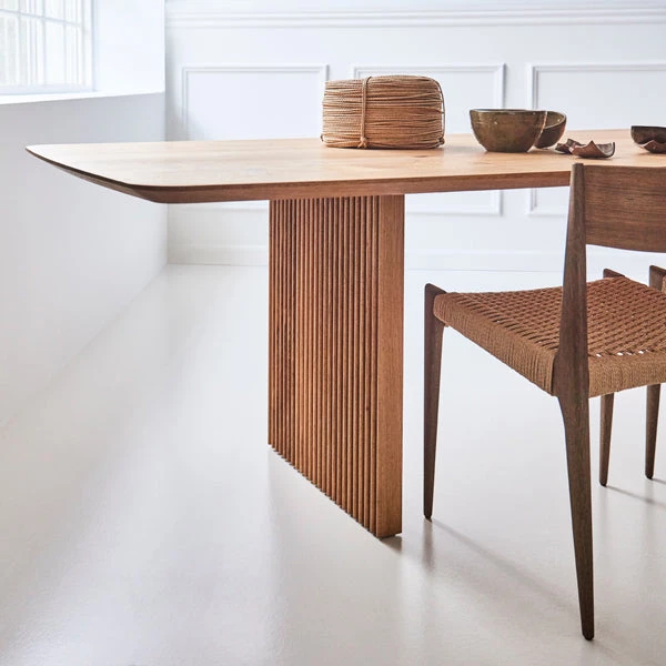 The tabletop and table legs are made of solid wood, but despite the table’s heaviness in size and weight, it still has a lightness, which is emphasized by the refined crafted details like the beautiful vertical grooves of the legs and the distinctive, organic-shaped tabletop. The slightly curved shape of the tabletop does not have any straight lines at all, and in combination with the sloping table edge, it looks like the tabletop is constantly moving. The curving movement continues on the extension leaves, which completes the overall impression and gives the table a unique expression.