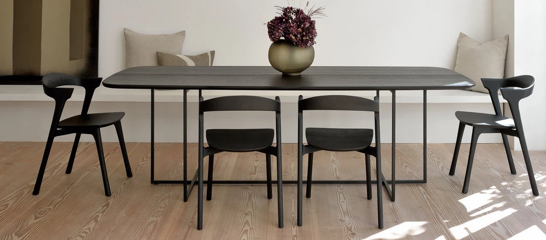 Come together for work or pleasure with the Oak Arc dining table. Combining a tapered black metal leg base against a brushed black Oak finish, the Arc’s design is a refined form featuring a unique light ambience and slightly rounded tabletop. A contemporary masterpiece by Alain Van Havre.