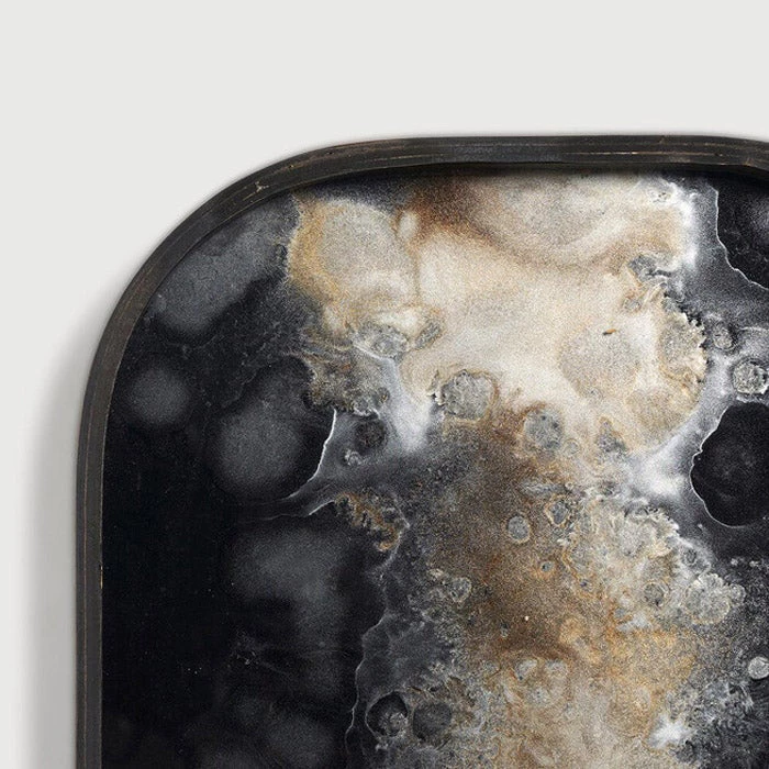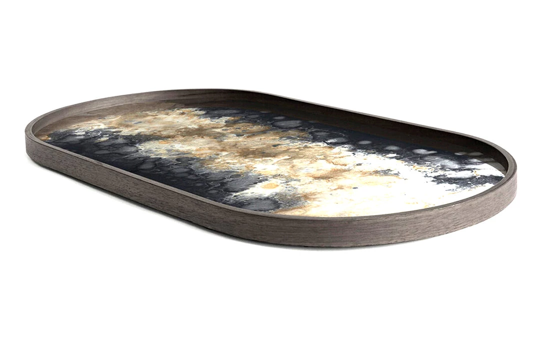 A subdued color palette meets captivating motifs inspired by nature and travel. This Black Organic glass valet tray experiments with the balance between rich patterns offset with muted tones, revealing the beauty behind the deceivingly ordinary subjects from which inspiration is drawn. In doing so, this collection captures the essence of timelessness.