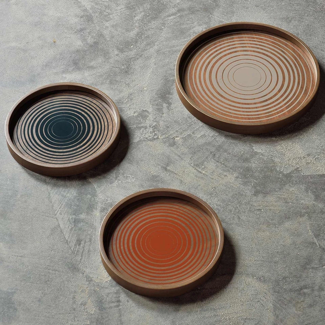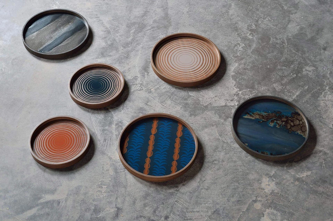 Organic movement meets linear shapes in the Linear Flow tray collection. This Cream Circles glass valet tray is inspired by the ink drawings at the beginning of the design process, when the pigment hits the glass it takes on a remarkable life of its own. Complementary effects are revealed in unexpected ways, where hand sketched and painted linear patterns generate a truly distinctive finish.