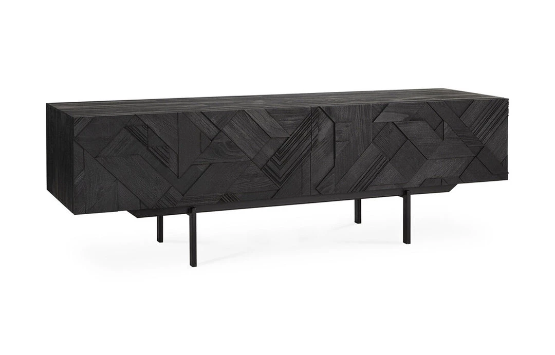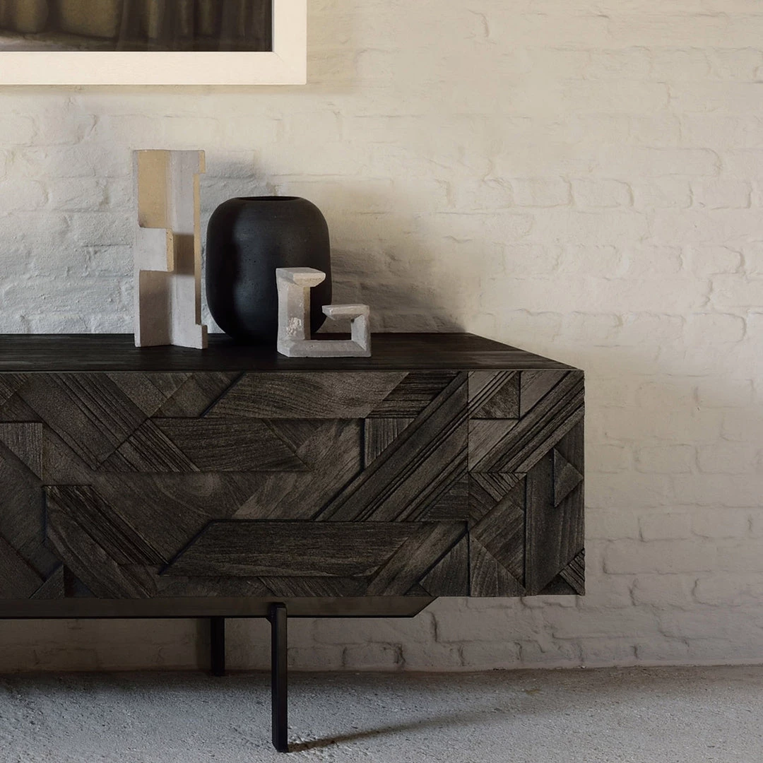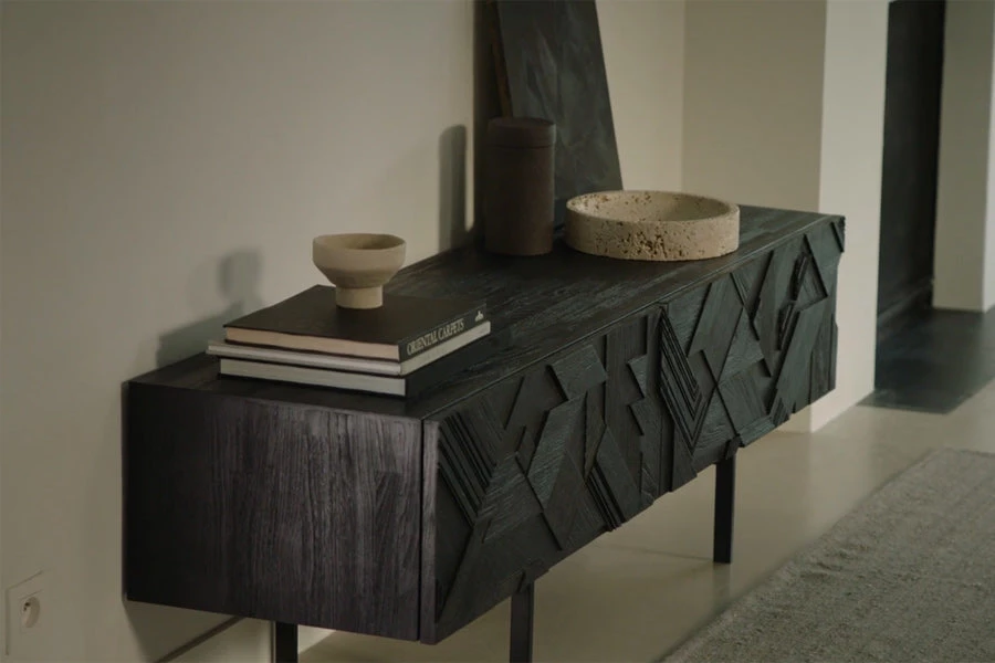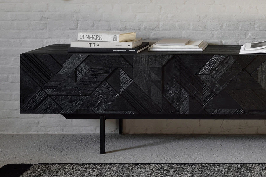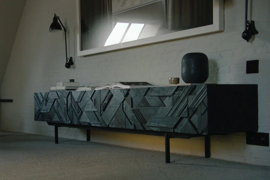 In his quest to add movement to the surface, our designer Alain van Havre started layering and combining triangular shapes. Before he knew it, he had created an interesting composition out of teak. We ended up brushing the surface to highlight the grain and further emphasize the feeling of motion. Originally used for our popular Teak Graphic sideboard, the pattern now translates perfectly to a new TV cupboard.