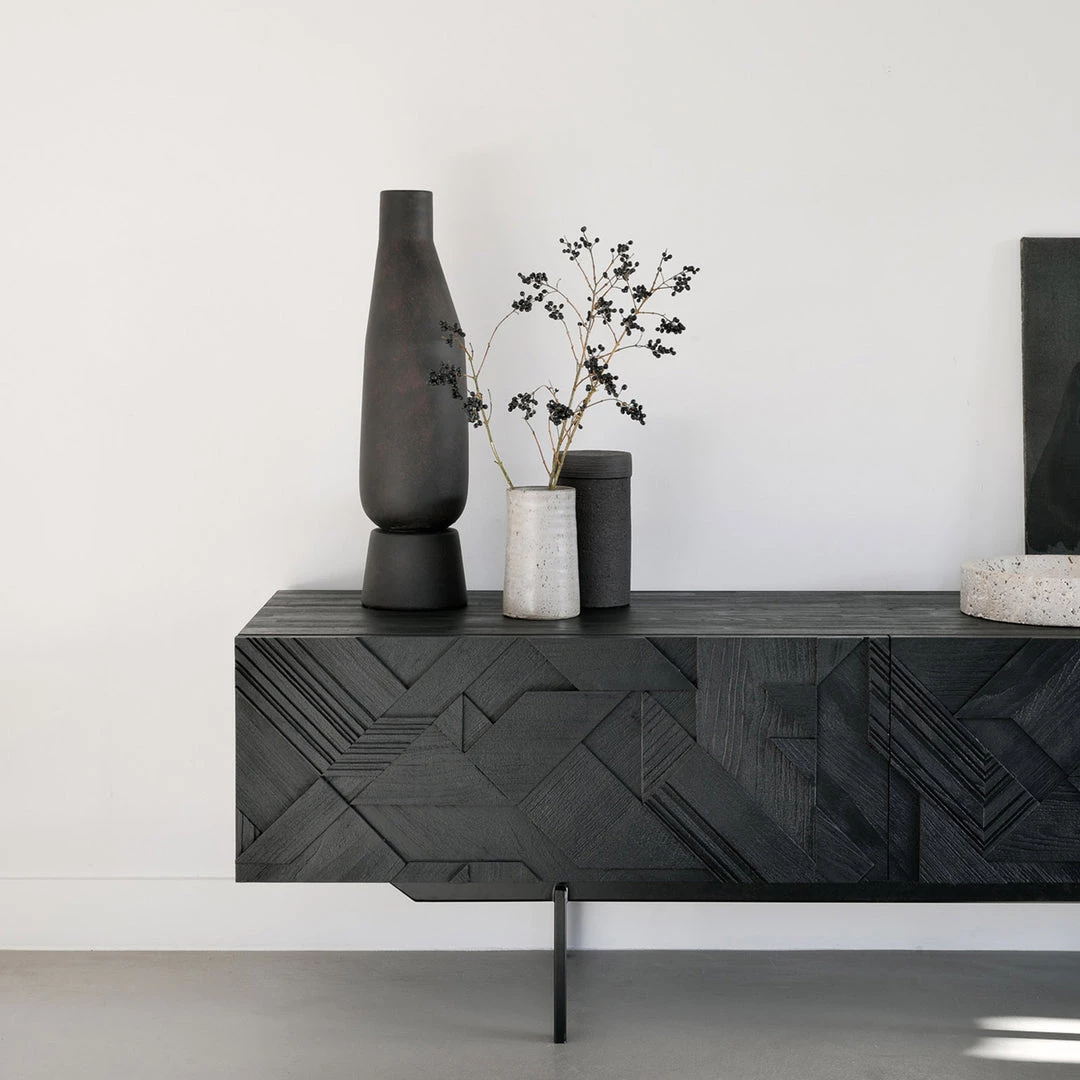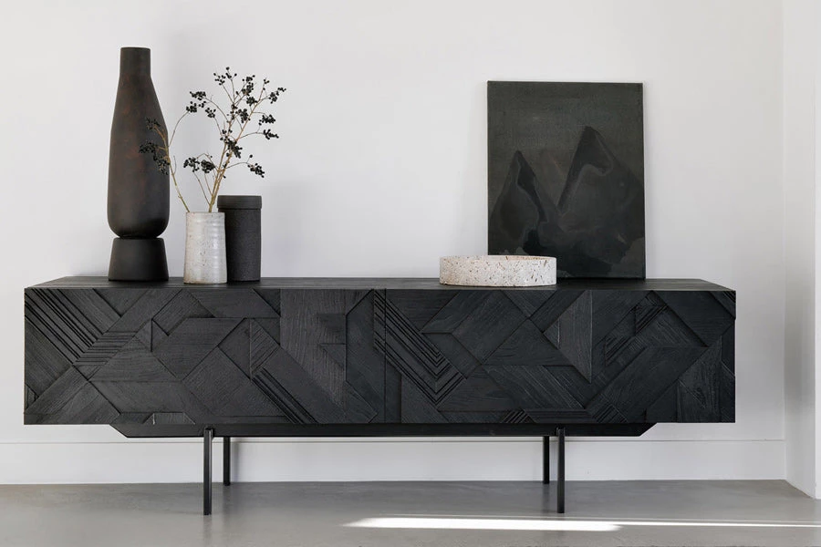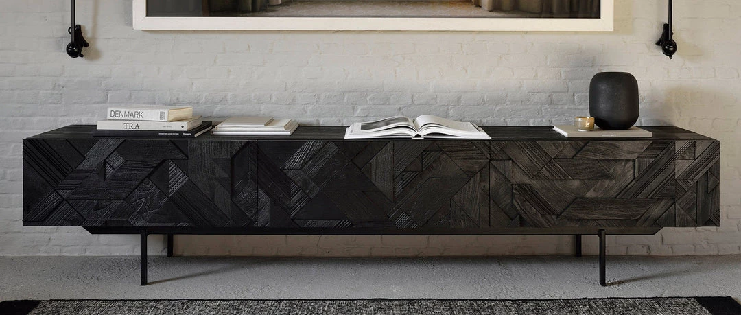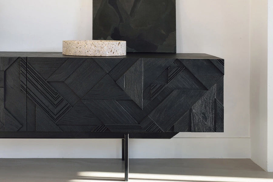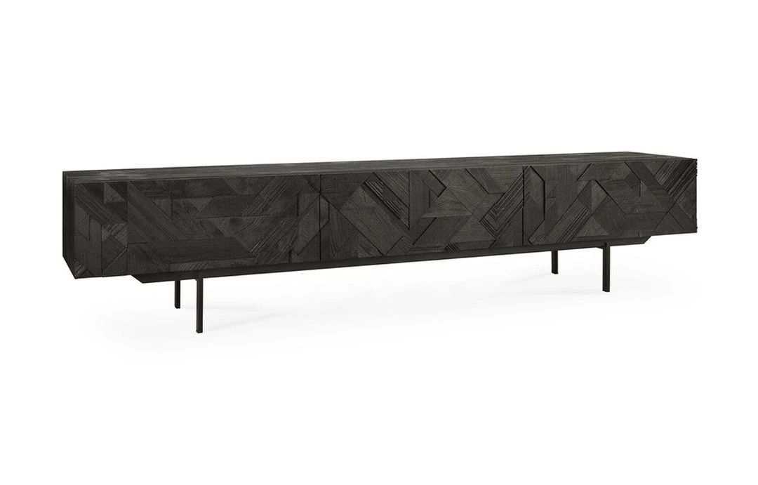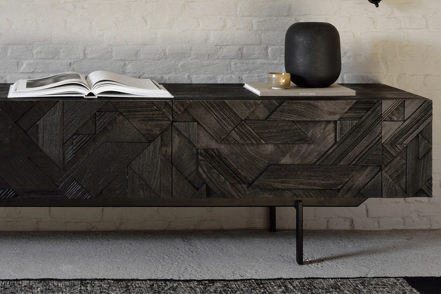 In his quest to add movement to the surface, our designer Alain van Havre started layering and combining triangular shapes. Before he knew it, he had created an interesting composition out of teak. We ended up brushing the surface to highlight the grain and further emphasize the feeling of motion. Originally used for our popular Teak Graphic sideboard, the pattern now translates perfectly to a new TV cupboard.