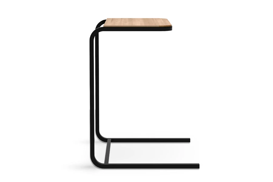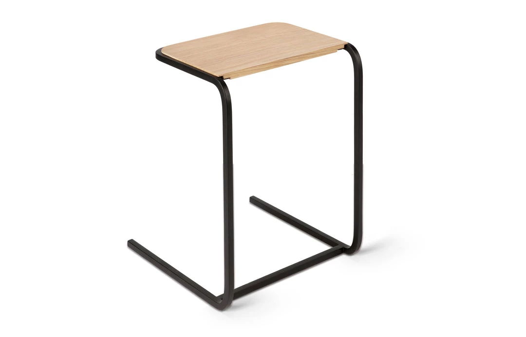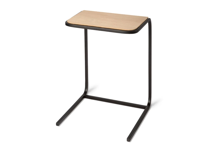 The N701 side table was designed specifically for the popular homonymous sofa. Its thin metal legs slide under the sofa smoothly, while the oak table top provides more surface. Designed by Jacques Deneef.