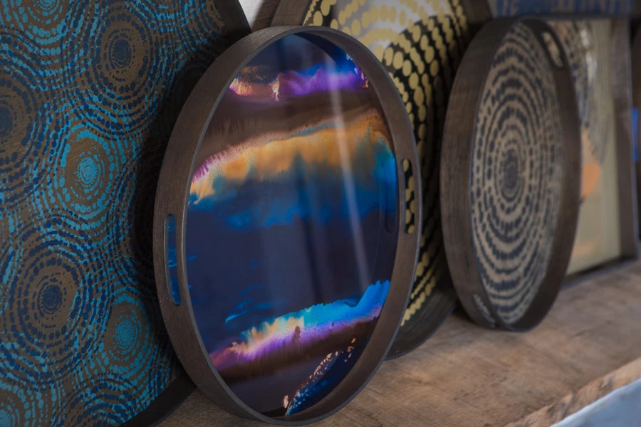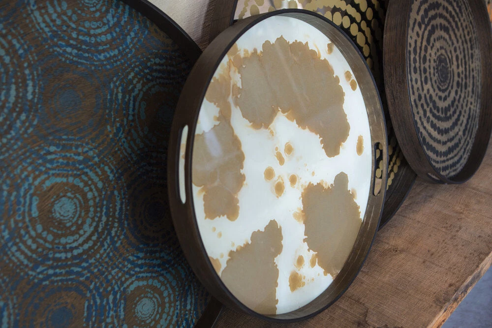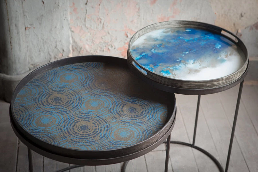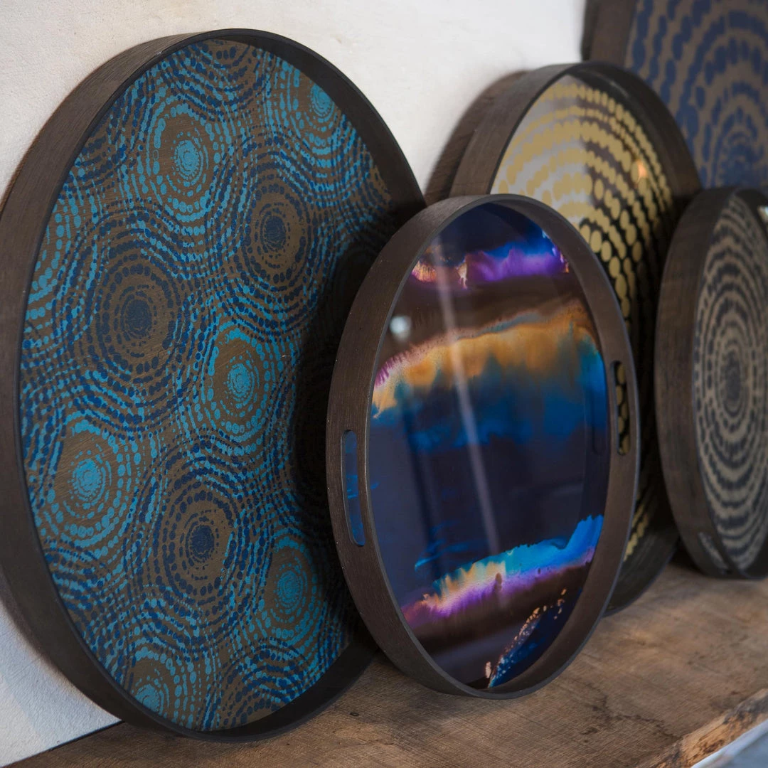 Reminiscent of a riverbed’s movement and reflective metallics, organic movement meets linear shapes in the Linear Flow tray collection. This Slate Organic glass tray is inspired by the ink drawings at the beginning of the design process, when the pigment hits the glass it takes on a remarkable life of its own. Complementary effects are revealed in unexpected ways.