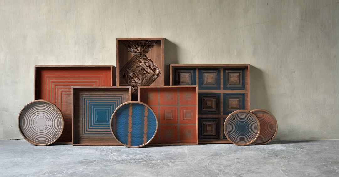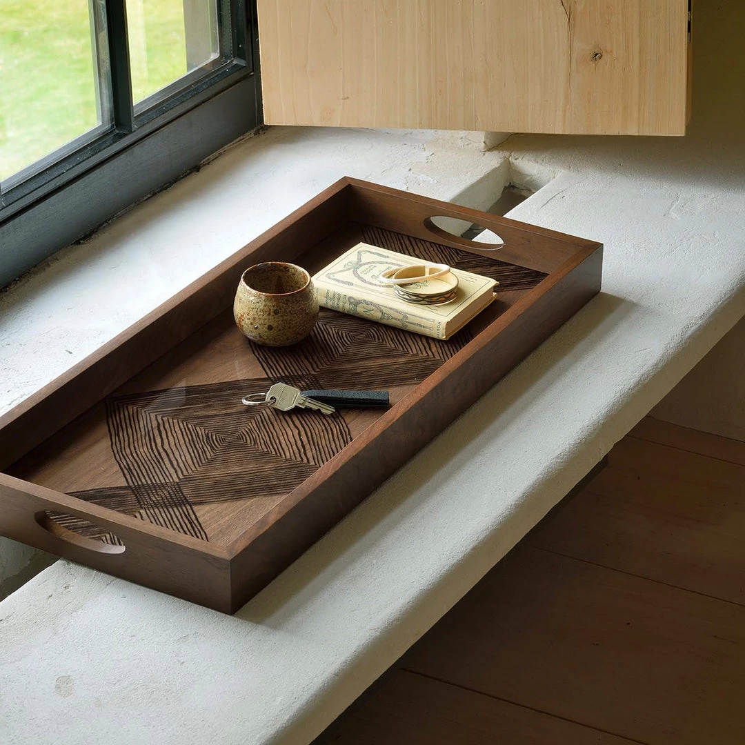 Organic movement meets linear shapes in the Linear Flow tray collection. This Walnut Linear Squares glass tray is inspired by the ink drawings at the beginning of the design process, when the pigment hits the glass it takes on a remarkable life of its own. Complementary effects are revealed in unexpected ways, where hand sketched and painted linear patterns generate a truly distinctive finish.