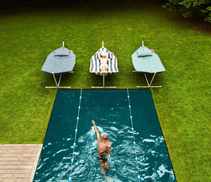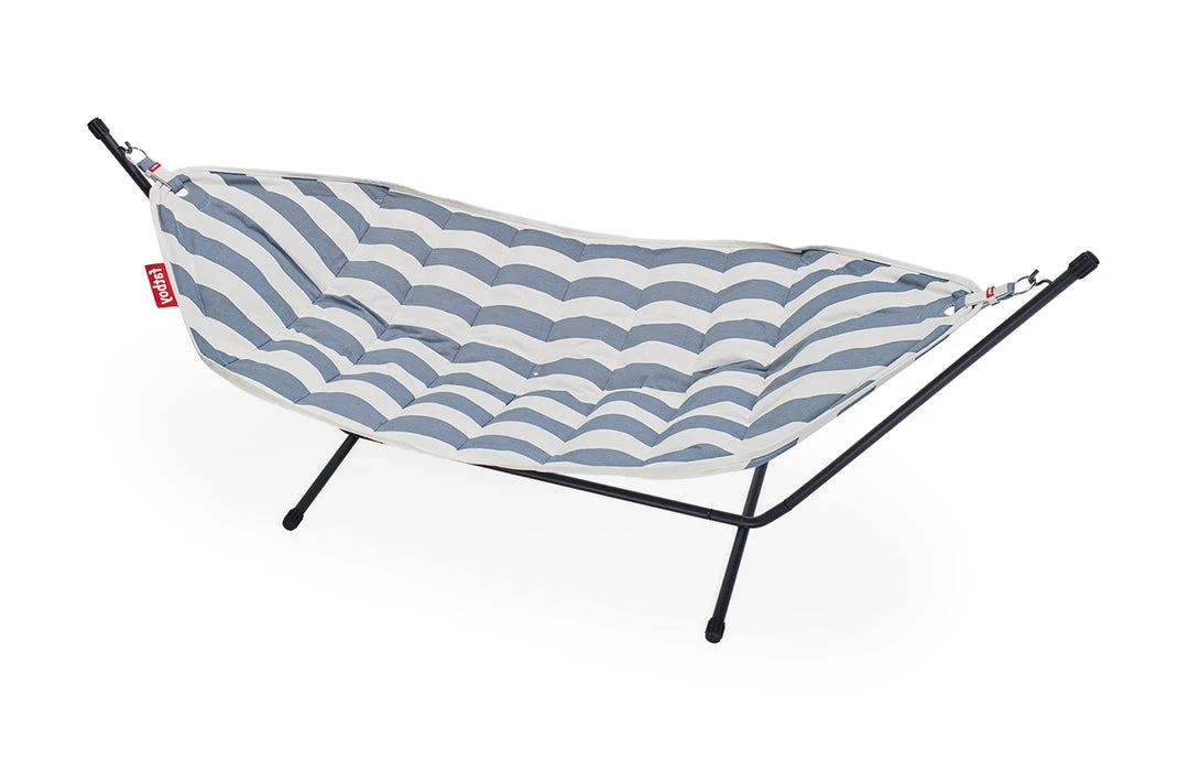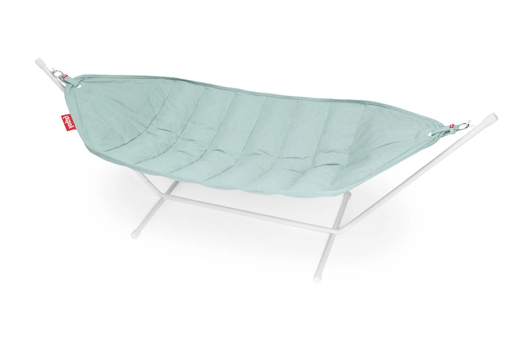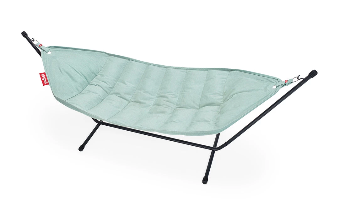 The Headdemock Superb hammock from Fatboy invites you to relax indoors or outdoors. Used on your city balcony, on your back patio, by the pool, in the park, or on the beach, you can forget the worries of everyday life and relax in the hammock. In contrast to the classic Headdemock hammock, this version features Olefin fabric, which is extremely durable as well as water and dirt repellent. In addition, the material is UV-resistant and retains its shape, color and structure, even in strong sunlight. Dirt can easily be removed with a damp cloth and mild soap. Because of its size, the Headdemock Superb hammock can be used by two or three people, with a maximum load capacity of 330 lbs. Like most hammocks, the Headdemock Sunbrella does not require a tree or a pole: A stable, powder-coated steel frame serves as support for the hammock. The Headdemock’s included carrying case makes it easy to move to another location. After use, the frame can be easily disassembled and stored in a space-saving carrying bag.
