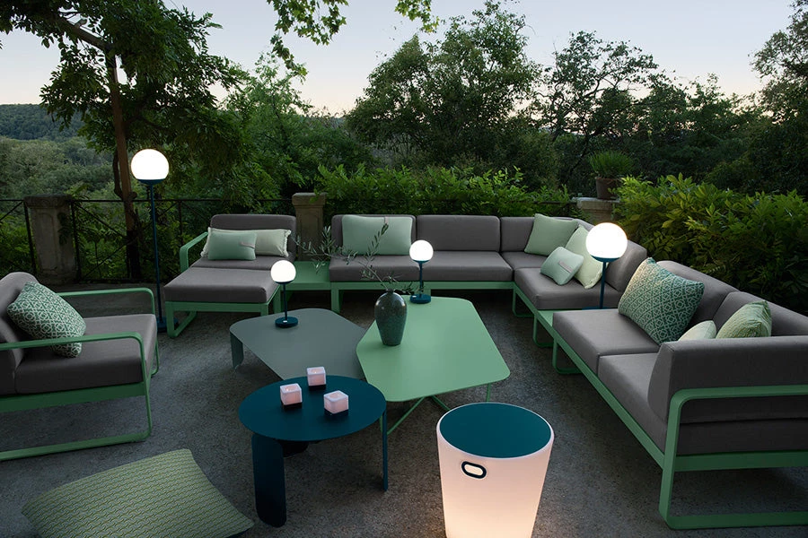 INOUI is an innovative illustration of Fermob’s excellence in outdoor space design and decoration. It can be used as a low table, stool, light, pedestal or decorative object. It also features an on-board Bluetooth system. It is mobile and wireless operated, to be recharged on a base. It has a practical aluminum handle that also hides the switch. This unique piece offers 2 brightness settings, 2 light temperatures and 6 colors. There’ll be many enchanted gardens and festive patios with the INOUI present!