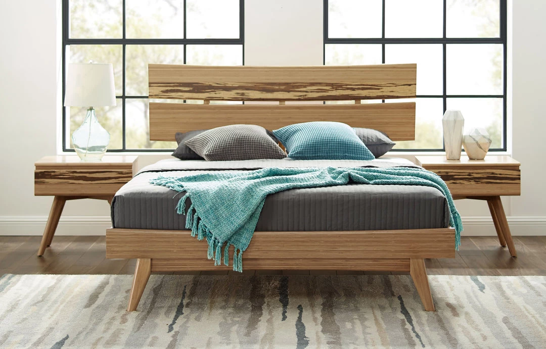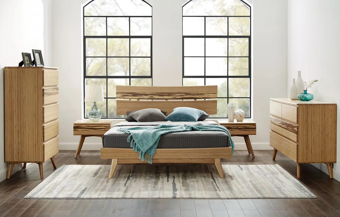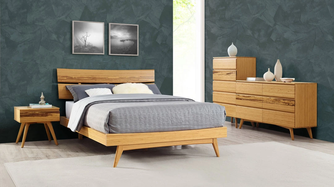 Expertly crafted in earth friendly solid bamboo, the Azara bedroom collection features sleek mid-century styling, clean lines and modern angled tapered legs. Beautifully finished on all four sides, the Azara’s smooth design shows off the beautiful color and grain of the solid bamboo material. Shown in rich Sable finish with accents in exotic Tiger bamboo. Exotic Tiger combines the light and dark material, creating a unique and beautifully striped grain with continuous colors throughout. No two pieces are exactly alike. Variation in grain and color enrich the natural beauty of bamboo furniture and make each piece unique. Slight differences in bamboo shade colors are signs that the furniture has been crafted from solid bamboo and is considered a benchmark of quality. Greenington combines beautiful design, rich colors and a winning sustainability story. Made in an ISO 14001 Environment Management certified facility, your purchase of this environmentally friendly bamboo product helps support forests and ecosystems worldwide.