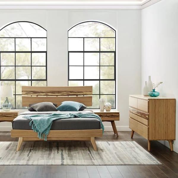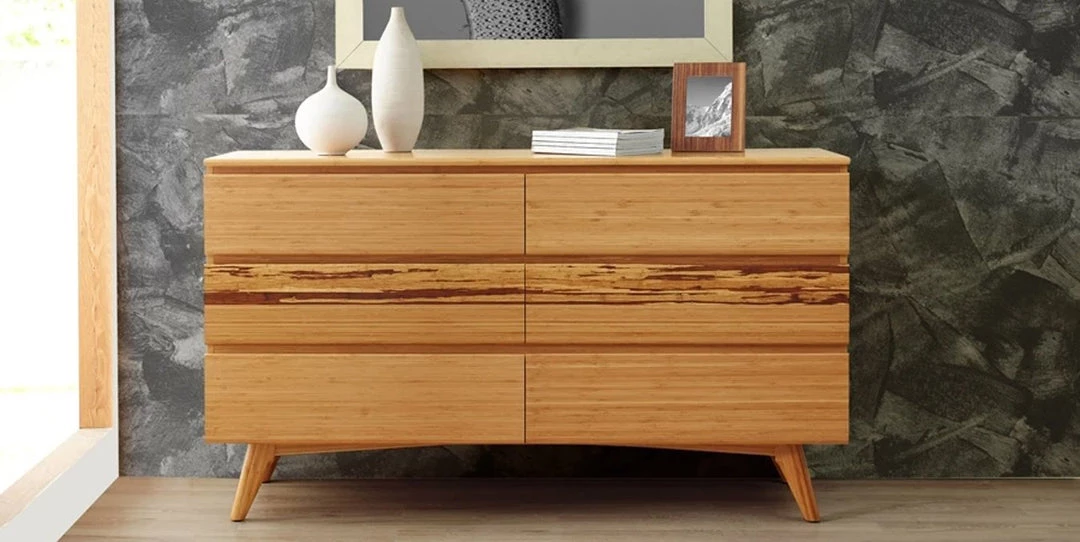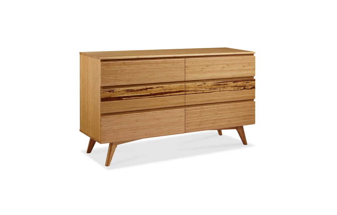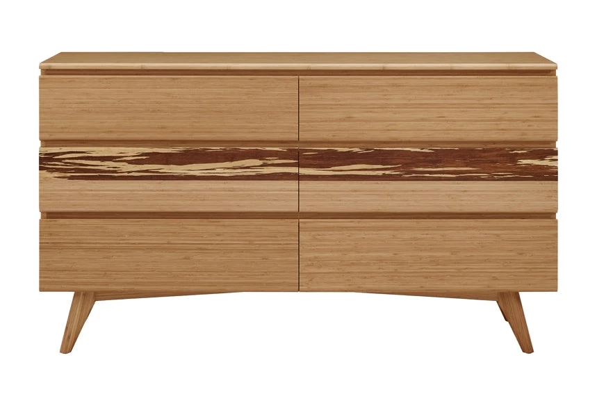 Showcasing the beautiful color and grain of solid bamboo, the Azara double dresser by Greenington features modern architectural lines, and stunning drawer accents in the natural beauty of exotic tiger bamboo. Beautifully finished on all four sides, the Azara dresser features include five sided drawer boxes with English dovetail, sleek recessed drawer pulls, under mount hardware and soft closing drawers. The Azara bedroom collection makes it easy for you to promote sustainability in a lovely, classic and functional way in your home.