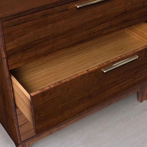 The Mercury three drawer dresser by Greenington brings the simple elegance of Mid-Century design into the modern home. Beautifully finished on all four sides, the Mercury double dresser features include five sided drawer boxes with English dovetail, sleek steel drawer pulls, and soft closing – under mount drawer glides. Crafted in exotic bamboo with the character, beauty, strength and feel of a truly one-of-a-kind, tropical hardwood. Exotic’s rich natural finish is not a stain, but the color that is achieved through the process of cooking the sugars in the bamboo with heat and pressure.