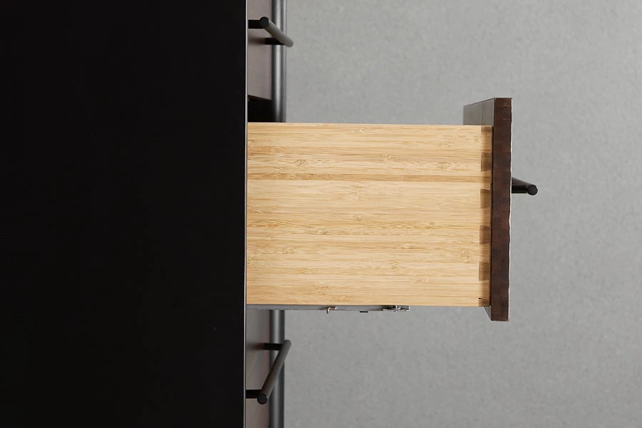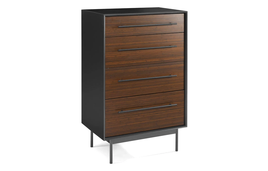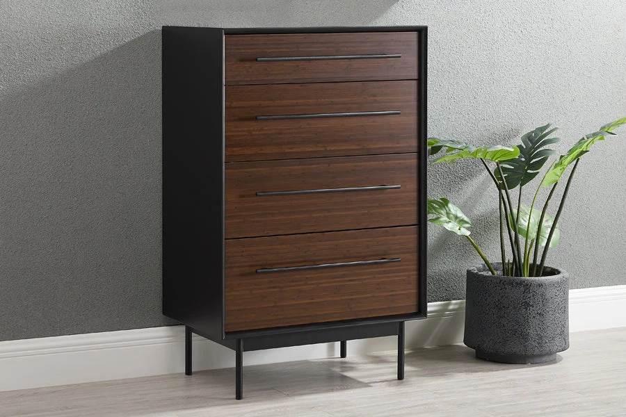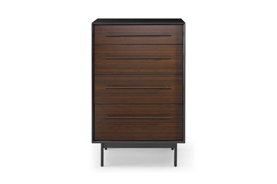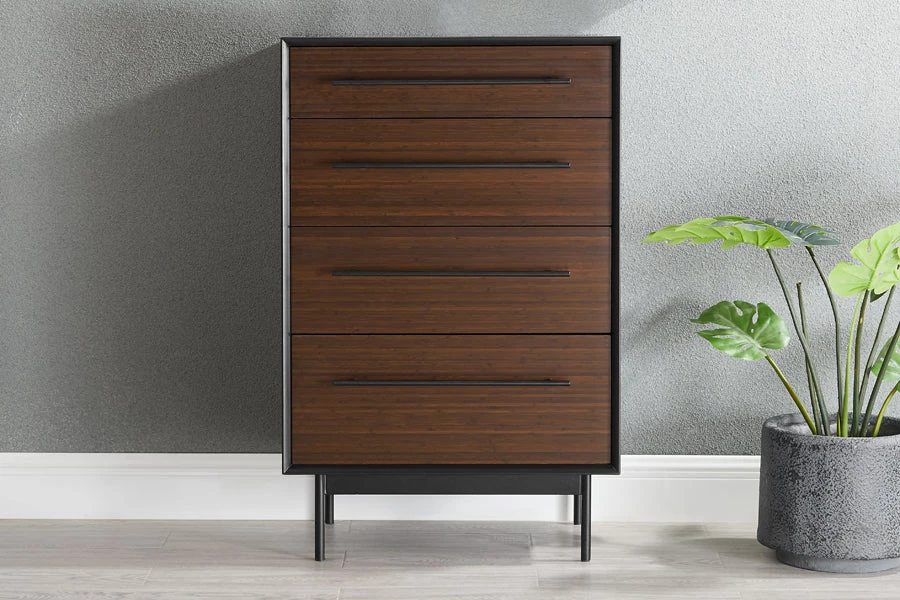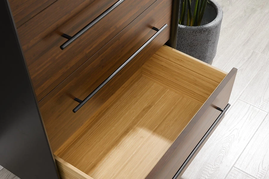 Create a clean, sophisticated look with Greenington’s Park Avenue bedroom collection. The sleek modern design and simple clean lines of the four drawer Park Avenue high chest features a craftsman-built frame made from solid bamboo, lacquered in a matte black finish on a strong steel base. Black steel accents complement dark Ruby bamboo drawers and black lacquer surfaces. Four wide solid bamboo drawers built using English dovetail joinery sits on under-mounted, soft-close glides for easy opening and closing. Each drawer is faced in dark Ruby solid bamboo material, with a contrasting interior of warm caramelized solid bamboo, and accented with a slim black steel drawer pull. Sustainable and earth friendly, Ruby is not a surface stain, the color is the result of an innovative new process using earth friendly heat and steam, to entirely transform the solid bamboo material into Ruby’s deep red color. Each Park Avenue high chest is beautifully finished on all four sides and ships professionally assembled. Discover the expert craftsmanship packed into each piece of Greenington bamboo furniture. Made using an eco-friendly, renewable resource harvested from fully sustainable and rapidly growing forests.