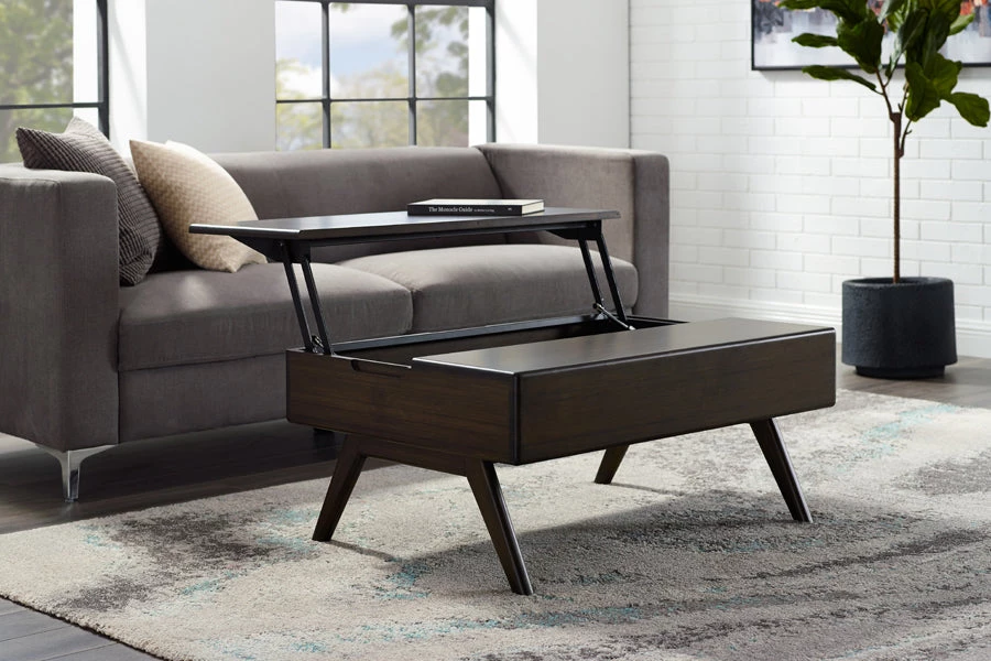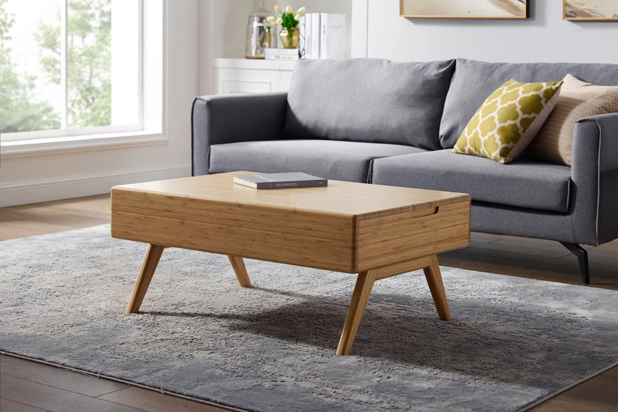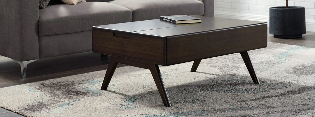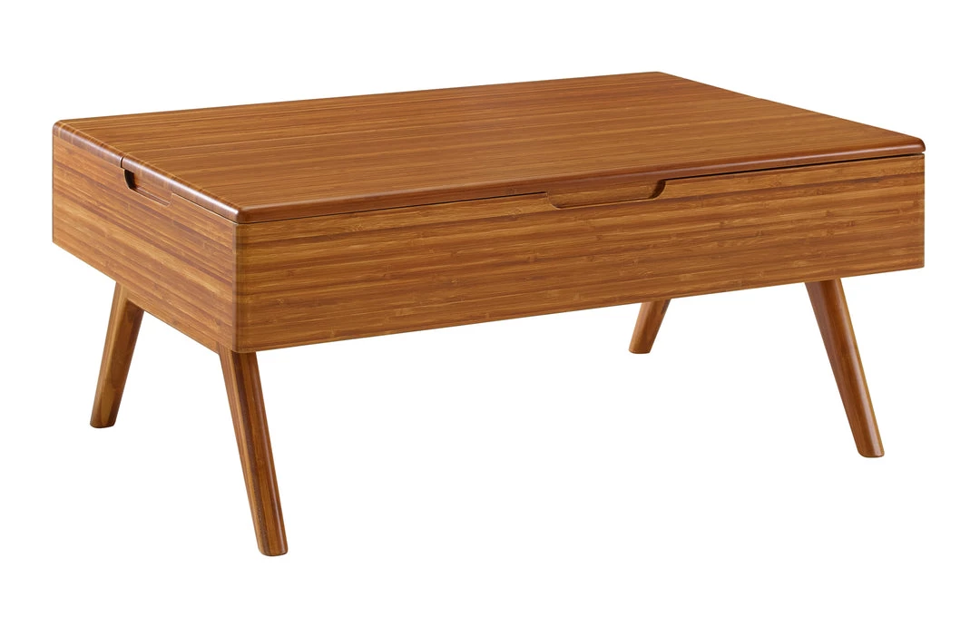 The Rhody Lift Top storage coffee table offers all that’s great about mid-century design. Beautifully finished on all 4 sides, the Rhody’s effortless lift top work surface reveals hidden interior storage, bringing style and essential function to your living space. Expertly crafted in earth friendly solid bamboo, and shown in our Amber finish. Variation in grain and color enrich the natural beauty of bamboo furniture and make each piece unique. Slight differences in bamboo shade colors are signs that the furniture has been crafted from solid bamboo and is considered a benchmark of quality. Ships fully assembled.