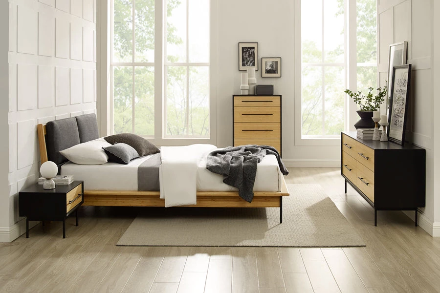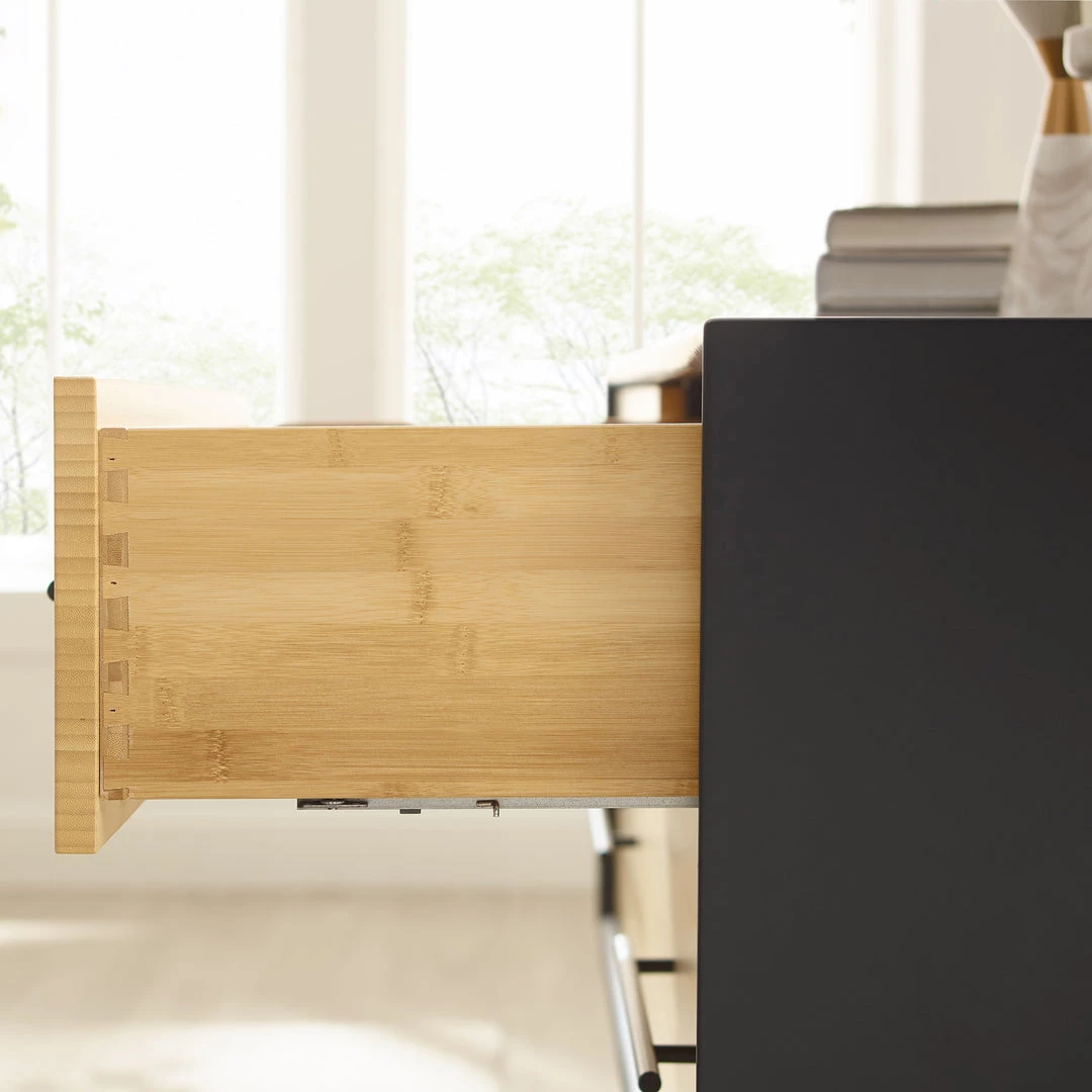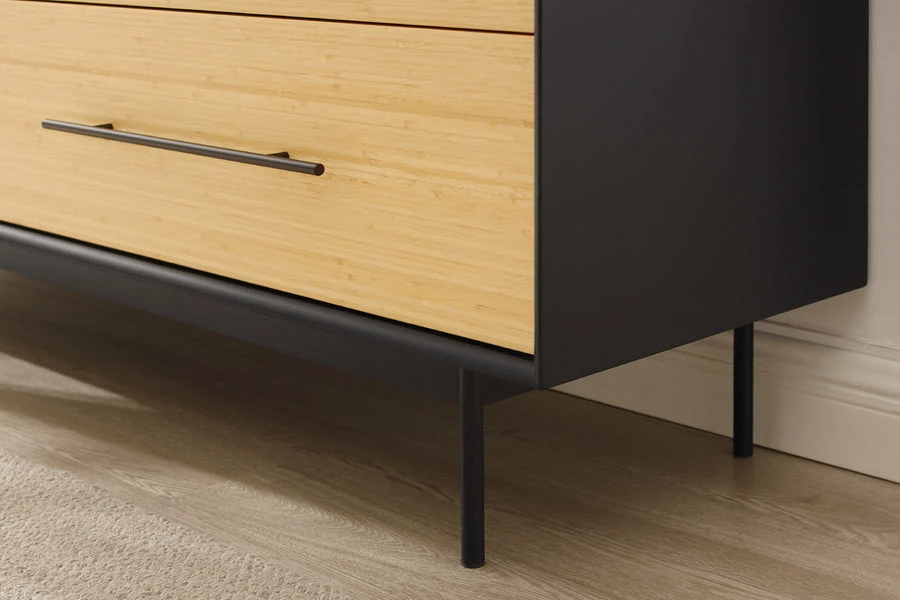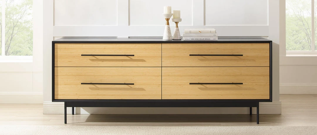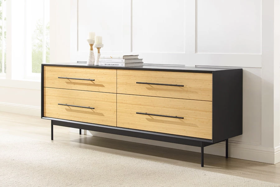 Create a casual and sophisticated look with Greenington’s Santa Cruz double dresser. The sleek modern design and simple clean lines of the four drawer Santa Cruz double dresser features a craftsman-built frame made from solid bamboo, lacquered in a matte black finish on a strong steel base. Black steel accents complement dark Wheat bamboo drawers and black lacquer surfaces. Four wide solid bamboo drawers built using English dovetail joinery sit on under-mounted, soft-close glides for easy opening and closing. Each drawer is faced in light Wheat solid bamboo material, with a drawer box of warm caramelized solid bamboo, and accented with a slim black steel drawer pull. Sustainable and earth friendly, Wheat is not a surface stain, the color is the result of an innovative process using heat, steam, and pressure to transform the solid bamboo material into light Wheat’s color. Each Santa Cruz dresser is beautifully finished on all four sides and ships professionally assembled. Discover the expert craftsmanship packed into each piece of Greenington bamboo furniture. Made using an eco-friendly, renewable resource harvested from fully sustainable and rapidly growing forests.