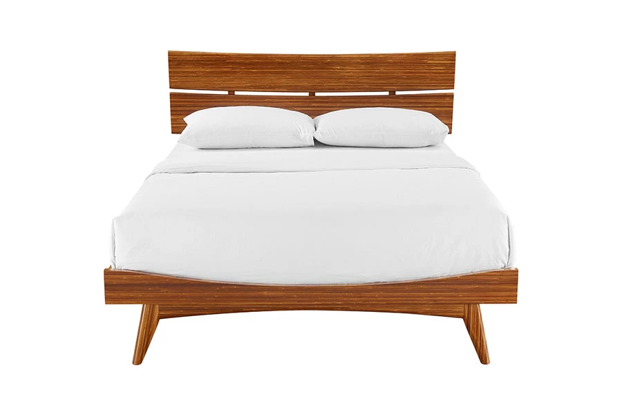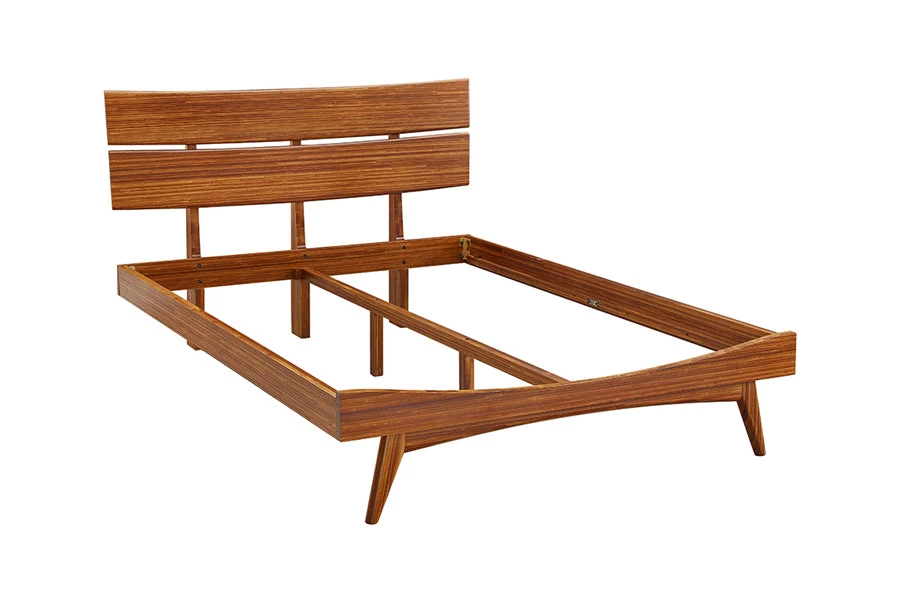 Artfully crafted in sustainable solid bamboo, the elegant Summit platform bed features a sweeping silhouette, contemporary splayed legs, and a deep Amber color. The Summit bed pairs perfectly with the Vale chests to create a transitional collection that compliments any style. Designed for use with a mattress only, the Summit platform bed is supported with a European slat system, eliminating the need for a box spring.