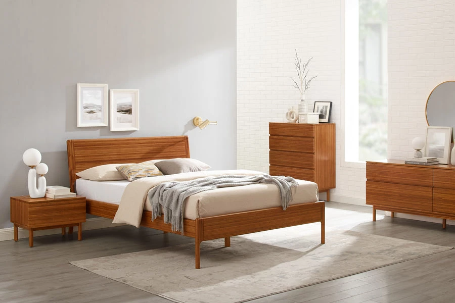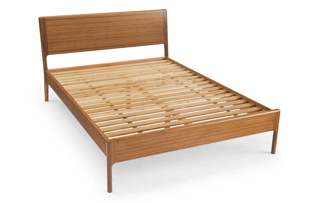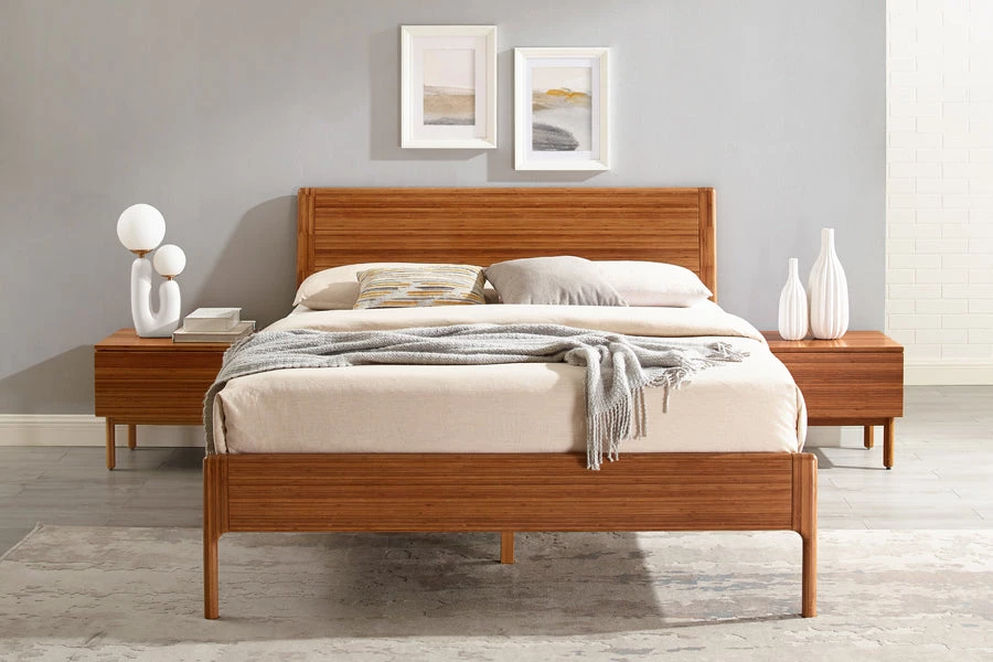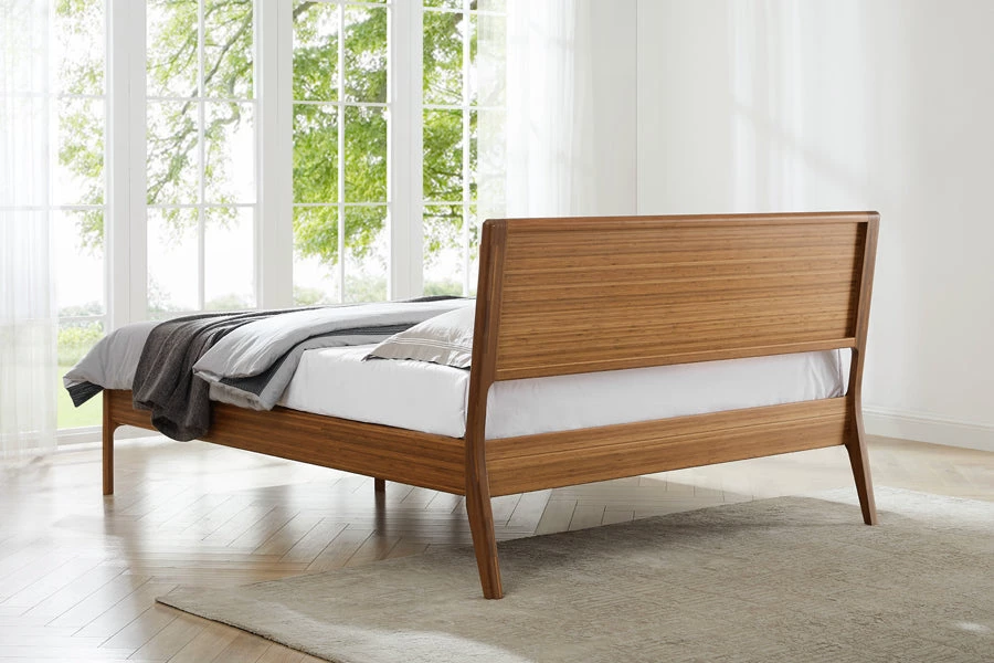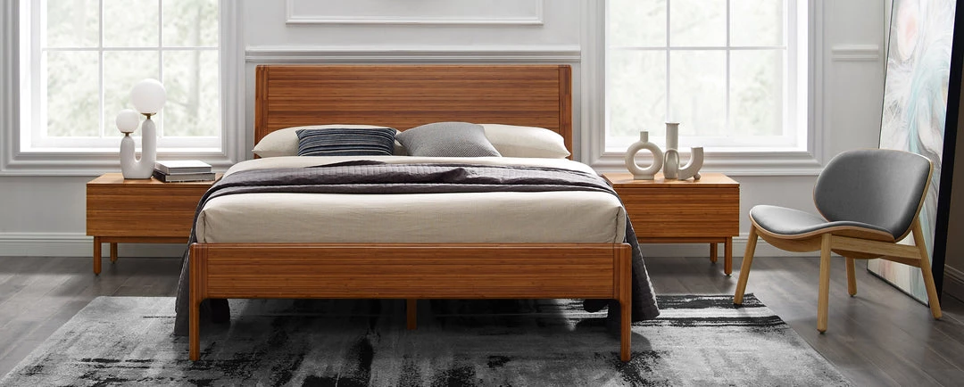 The quiet elegance of the Ventura bed is all about celebrating the beautiful grain of solid Amber bamboo. The modern style and simple clean lines of the Ventura platform bed show off the rich variety of Amber’s colors. The expert construction features a craftsman-built frame in solid sustainable bamboo, and the smooth detail where the headboard and footboard meet the frame is especially stunning. If you’ve been looking for a modern and elegant bed, this is the one. Sustainable and earth friendly, Amber is not a surface stain, the color is the result of an innovative new process using earth friendly heat and steam, to entirely transform the solid bamboo material into Amber’s deep color. The Ventura platform bed is designed for use with a mattress only, which is supported with a solid bamboo European slat system, eliminating the need for a box spring, and providing constant ventilation for your mattress. Available in Queen, Eastern King, and California King sizes. Discover the expert craftsmanship packed into each piece of Greenington bamboo furniture. Greenington furniture is made using an earth friendly, renewable resource harvested from fully sustainable and rapidly growing forests.