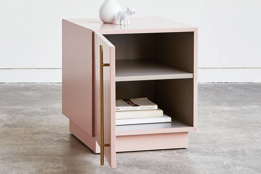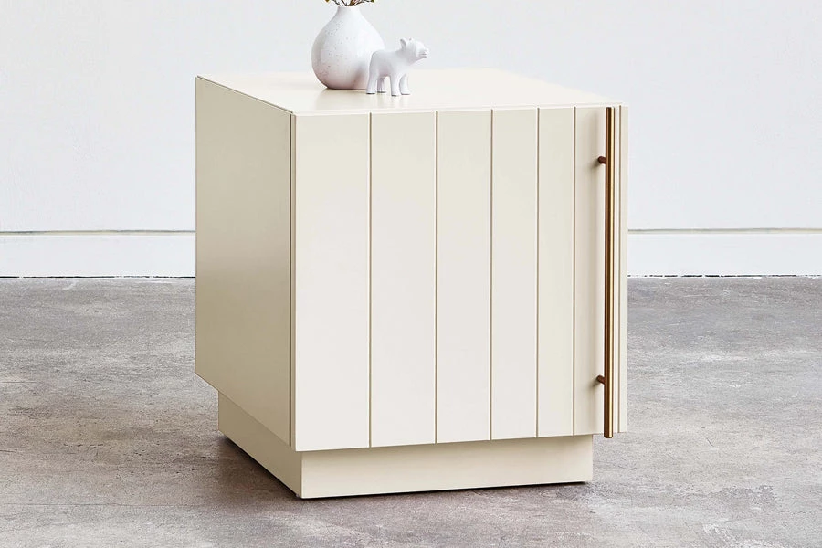 The Elora End Table combines the traditional aesthetic of classic beadboard cabinets with solid craftsmanship and muted, contemporary hues to create a distinctly modern design. Featuring a smooth satin finish, a delicate brass-plated handle, and a precision-cut door on an elevated platform, the Elora End Table provides ample storage within a minimalist, contemporary form. Part of the Elora Storage Series, this End Table matches perfectly with the Elora Cabinet and Media Stand.