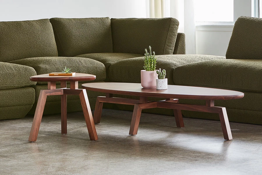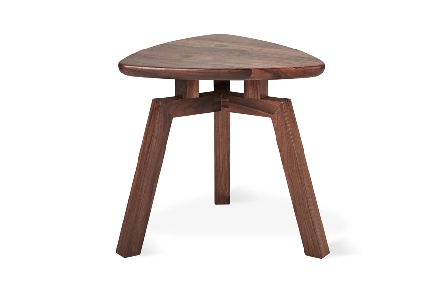 Channeling classic mid-century style with the relaxed ambiance of 1970’s Modernism, the Solana Triangular End Table showcases solid wood craftsmanship and sculptural beauty. The organic curves of the tabletop rest upon angular legs, creating a pleasing contrast unified by the warmth of the smooth wood grain. Visible joinery details—seamless wedged tenon joints in the top, finger joint detailing in the legs—add subtle interest to this refined accent piece. Part of the Solana Table Series, it is designed to nest with the Solana Oval or Triangular Coffee Table.