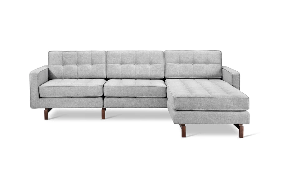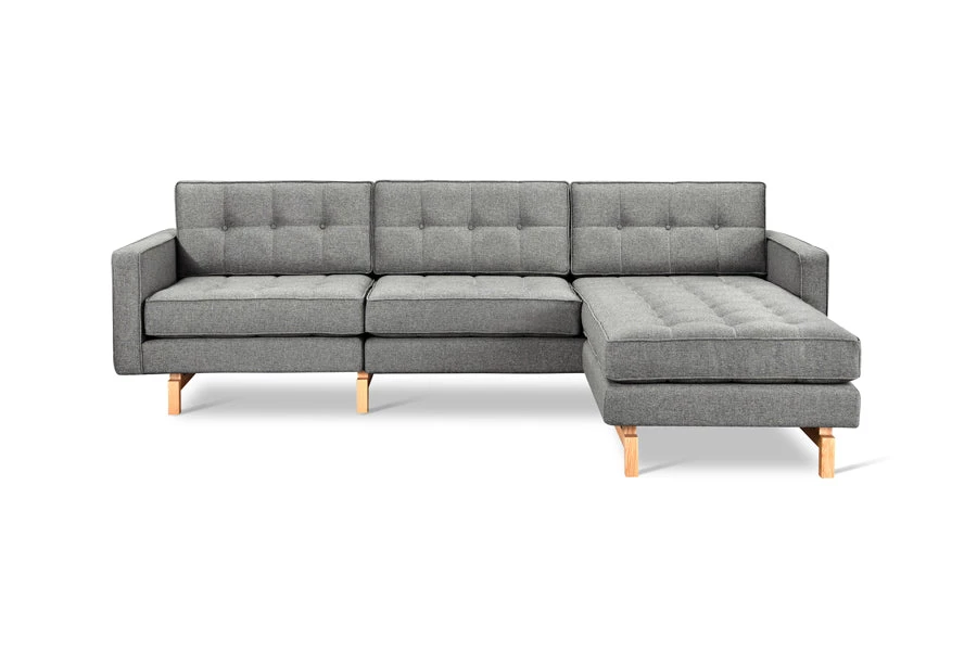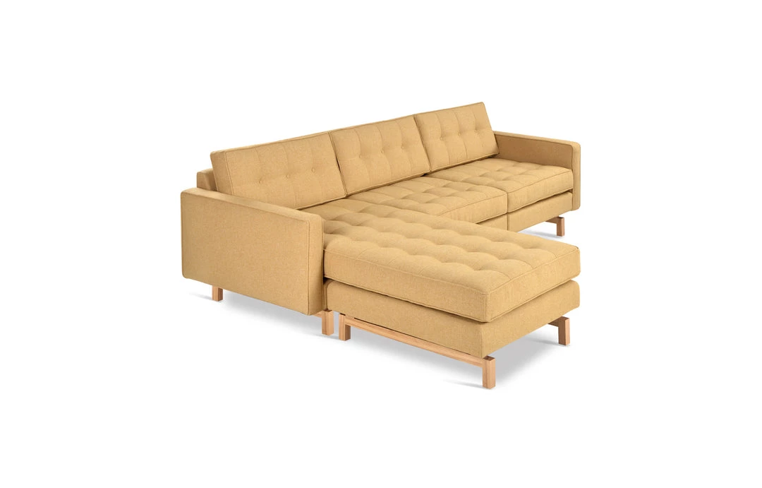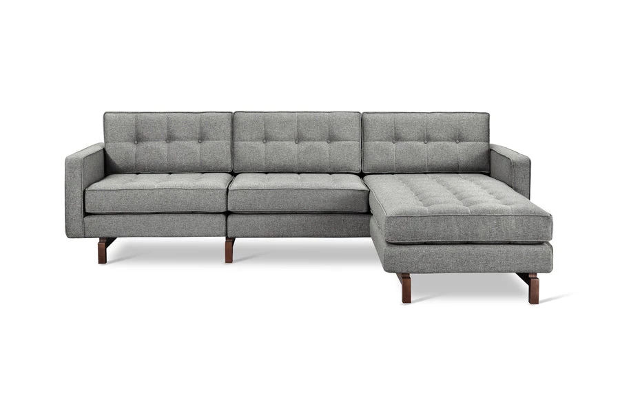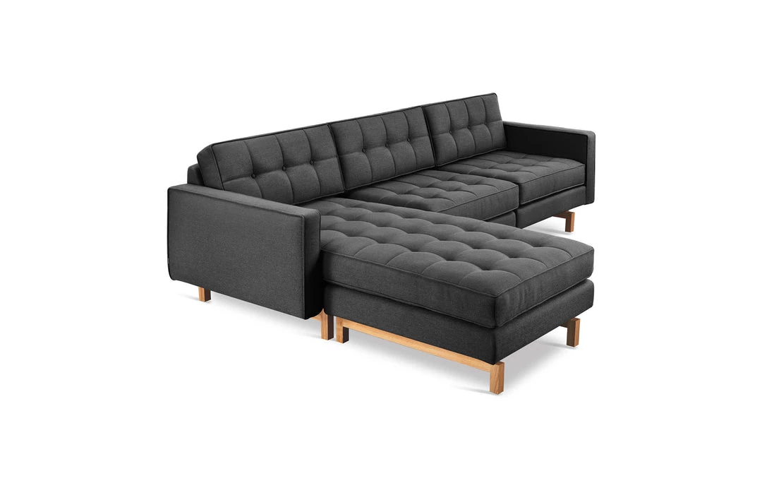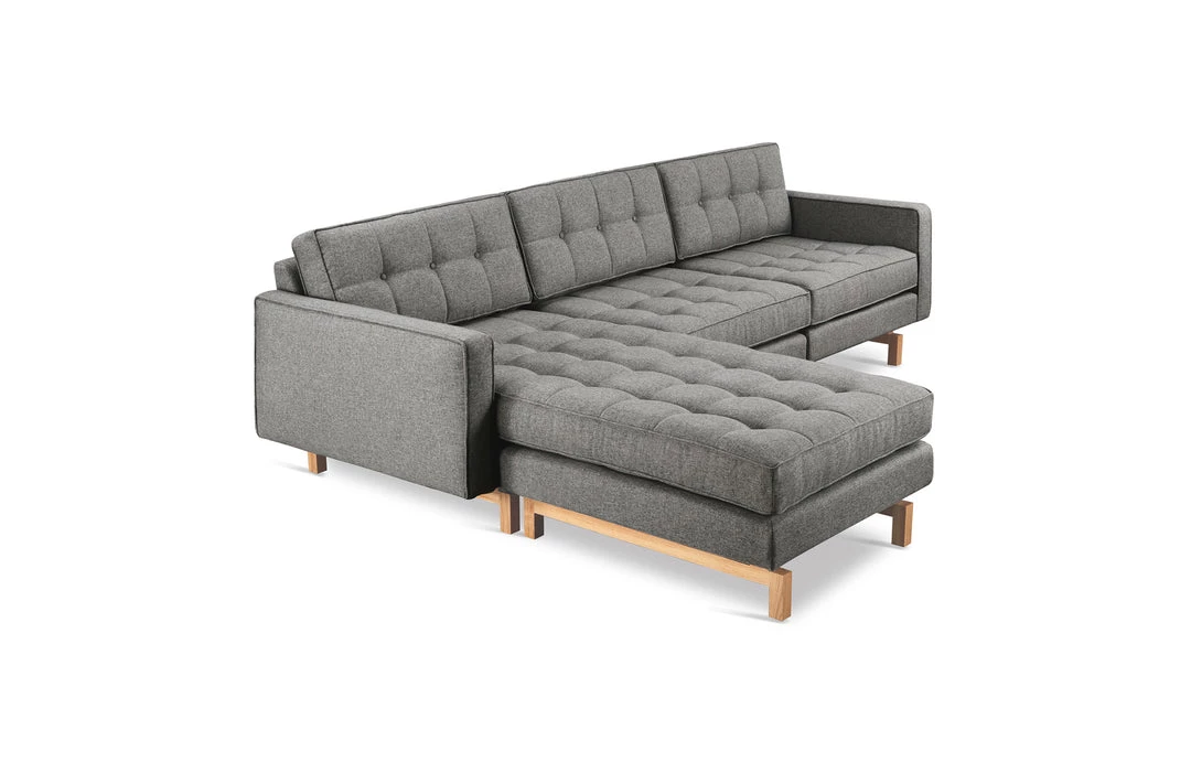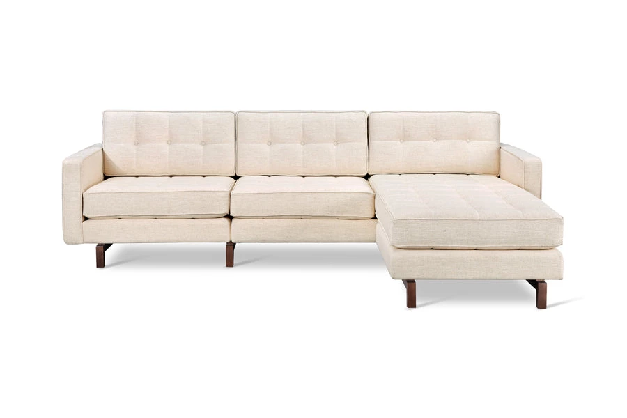 A modern update to the classic Gus* Modern Jane Series, the Jane 2 Bi-Sectional retains the iconic, mid-century look while adding contemporary enhancements. It has been cleverly designed so that it can be configured with the chaise on the left OR the right, depending on your floorplan. If your needs change, simply move the chaise and readjust the cushions to convert the design. Piped upholstery edges and button-tufted cushions create photogenic surface details that are enhanced by Jane 2’s new, more refined proportions. A new wood base (available in light or dark wood finish) is inset on each piece, creating a sense of weightlessness that maximizes light and space. The frames are constructed with kiln-dried 100% FSC®-Certified hardwood in support of responsible forest management.