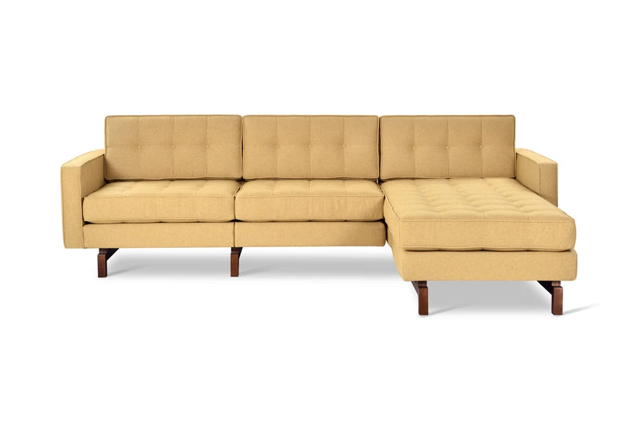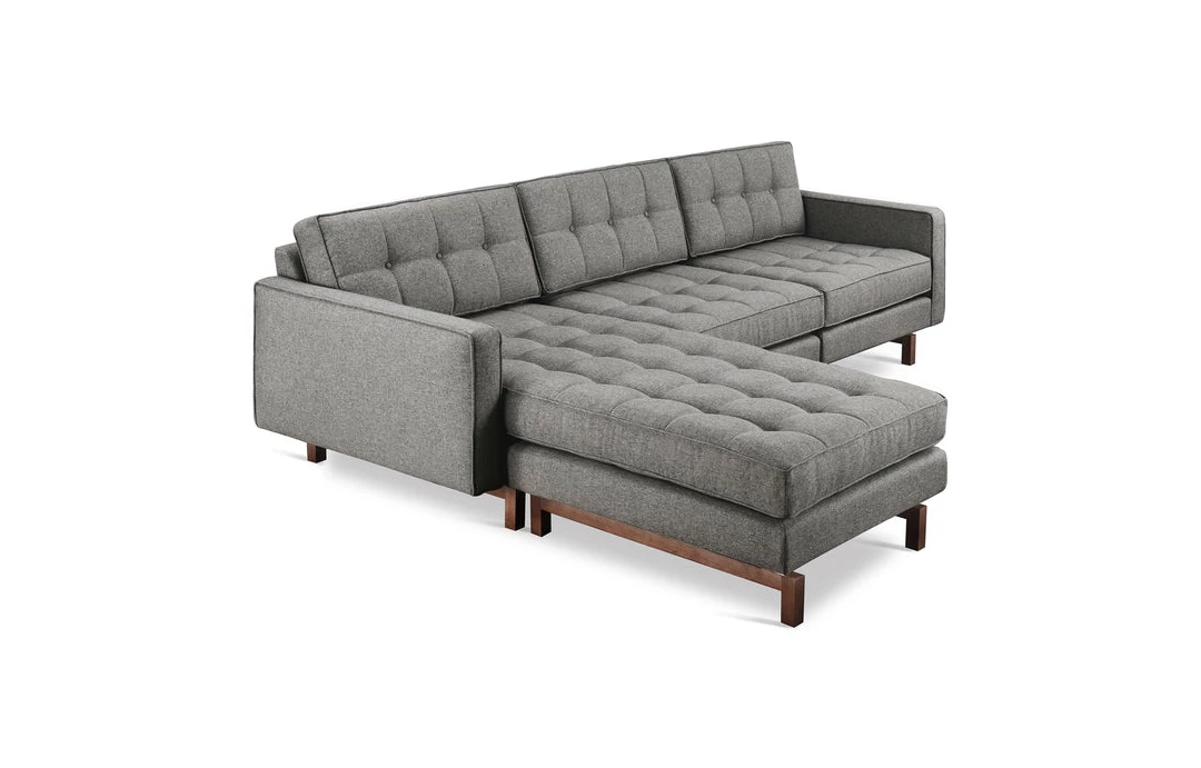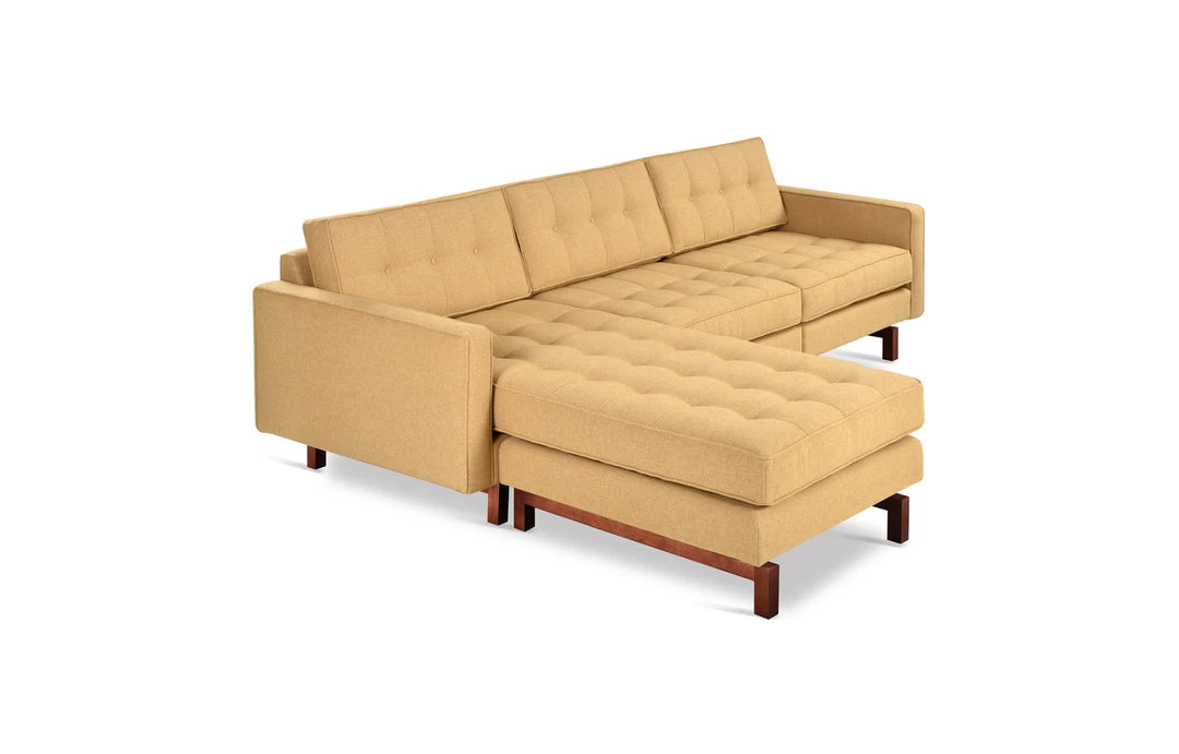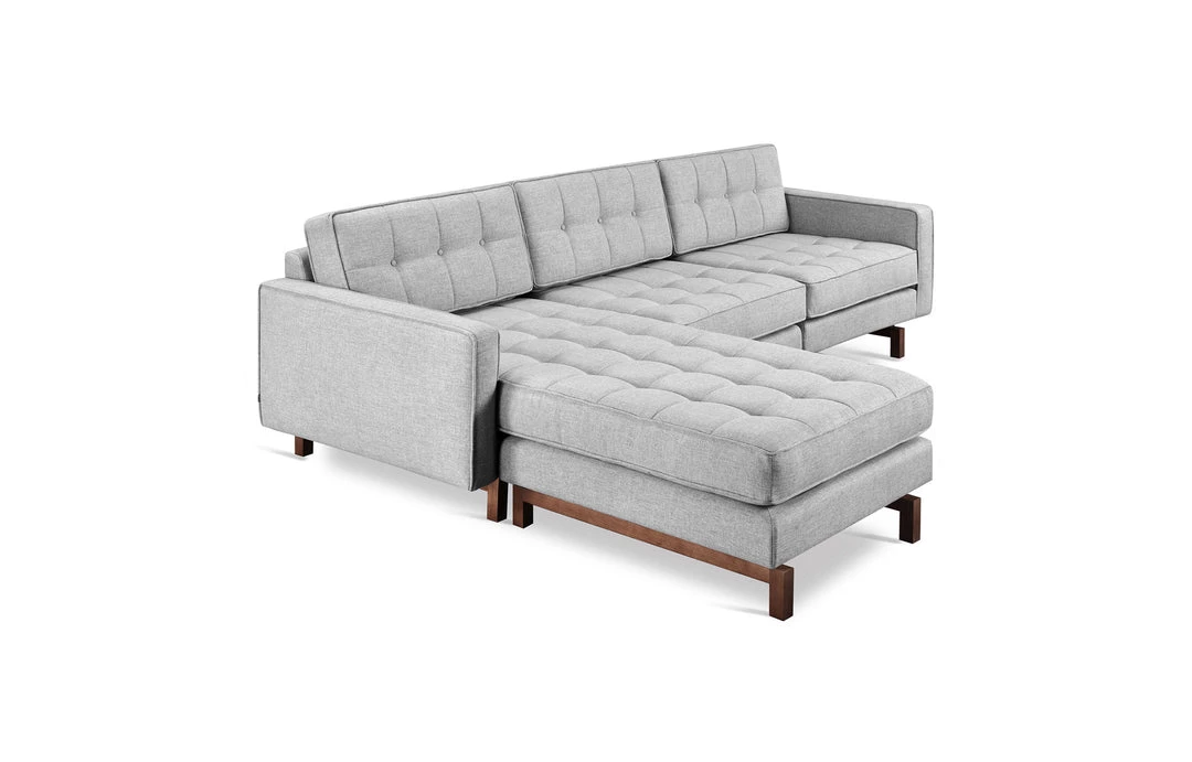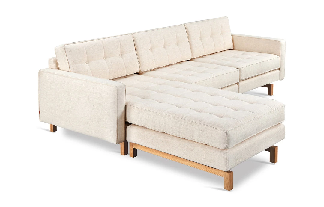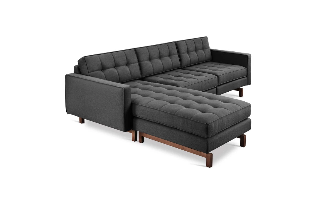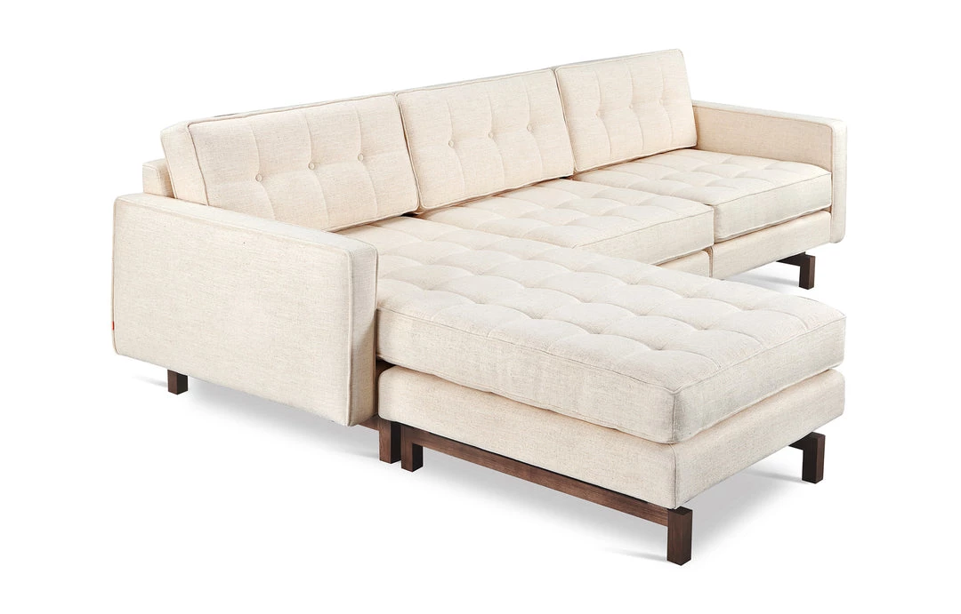 A modern update to the classic Gus* Modern Jane Series, the Jane 2 Bi-Sectional retains the iconic, mid-century look while adding contemporary enhancements. It has been cleverly designed so that it can be configured with the chaise on the left OR the right, depending on your floorplan. If your needs change, simply move the chaise and readjust the cushions to convert the design. Piped upholstery edges and button-tufted cushions create photogenic surface details that are enhanced by Jane 2’s new, more refined proportions. A new wood base (available in light or dark wood finish) is inset on each piece, creating a sense of weightlessness that maximizes light and space. The frames are constructed with kiln-dried 100% FSC®-Certified hardwood in support of responsible forest management.